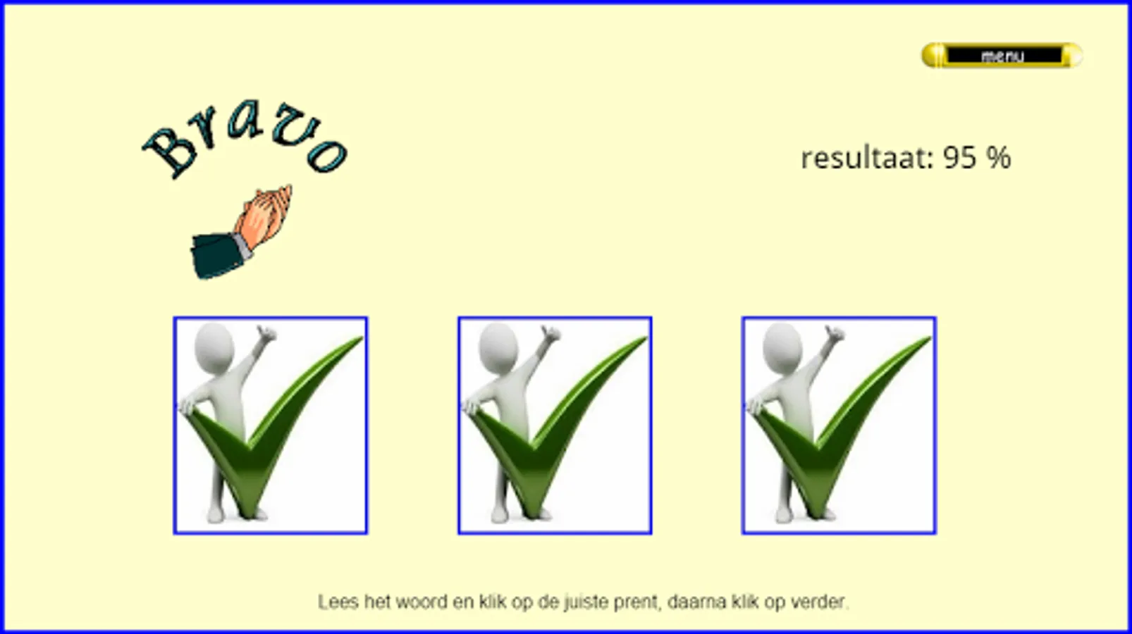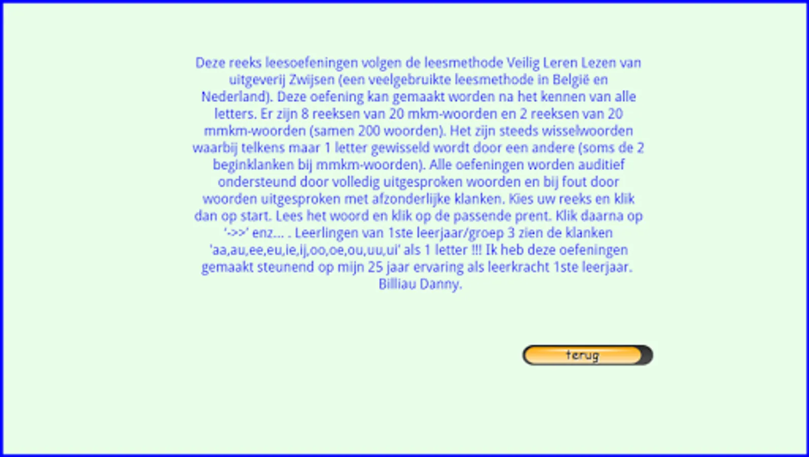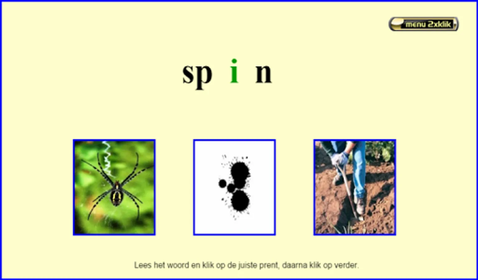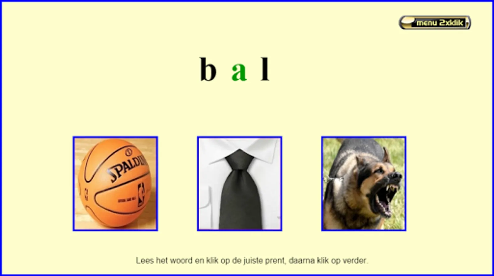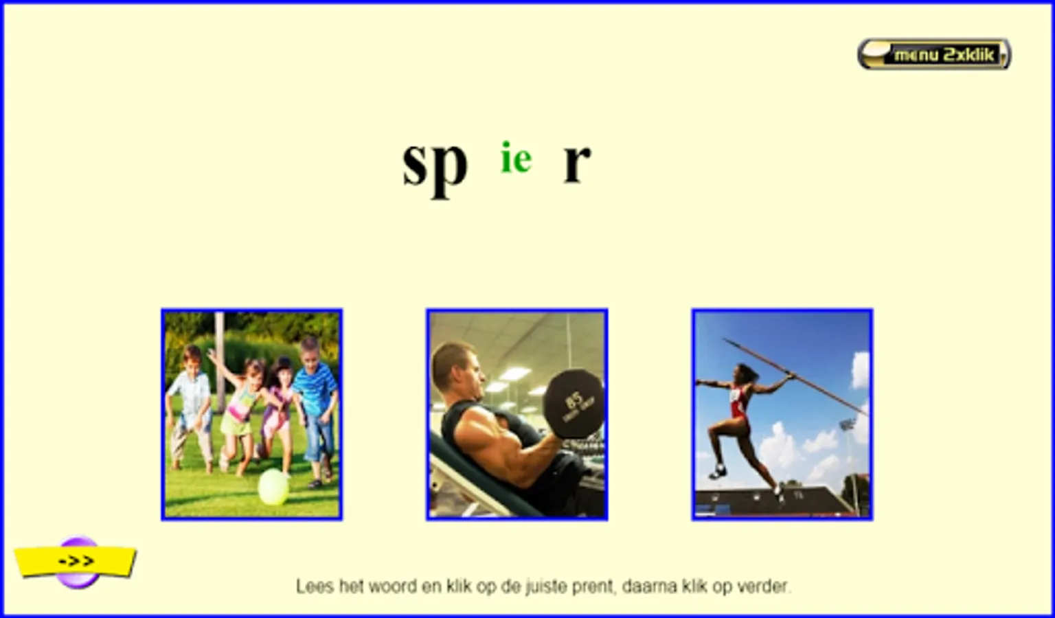This series of reading exercises follows the reading method Safe Learning to Read from Zwijsen publishers (a widely used reading method in Belgium and the Netherlands). This exercise can be done after knowing all the letters. There are 8 sets of 20 mkm words and 2 sets of 20 mmkm words (200 words together). They are always interchangeable words in which only 1 letter is exchanged for another (sometimes the 2 starting sounds with mmkm words). All exercises are supported auditory by fully pronounced words and, in case of error, by words pronounced with separate sounds. Choose your series and then click on start. Read the word and click on the appropriate picture. Then click on '->>' etc… . Students of 1st grade/group 3 see the sounds 'aa,au,ee,eu,ie,ij,oo,oe,ou,uu,ui' as 1 letter!!! I made these exercises based on my 25 years of experience as a 1st grade teacher. Headphones make the sound even better. Works best on tablets. Not so suitable for smartphones.