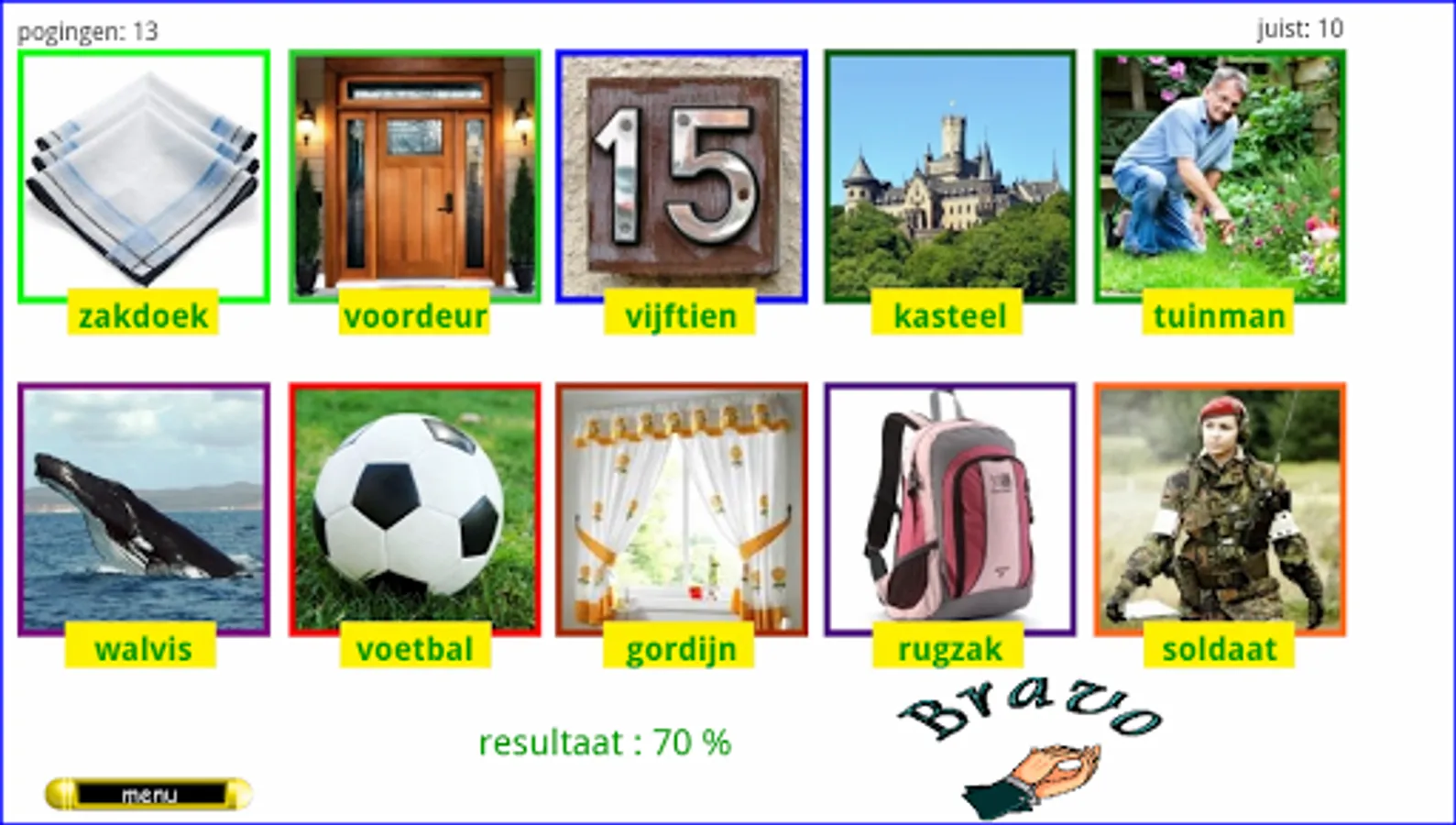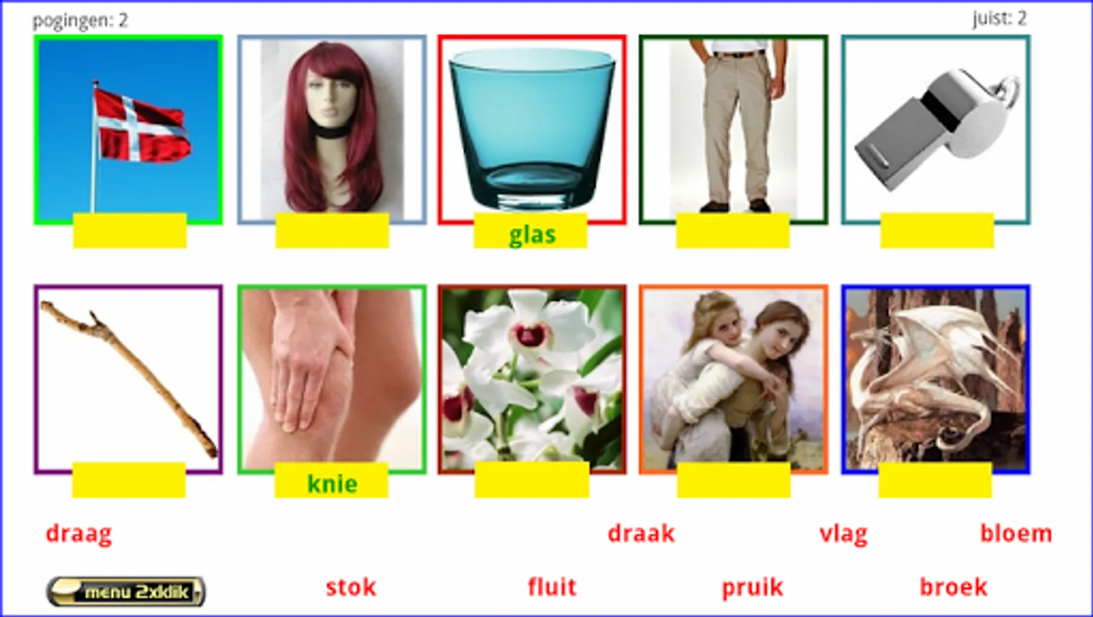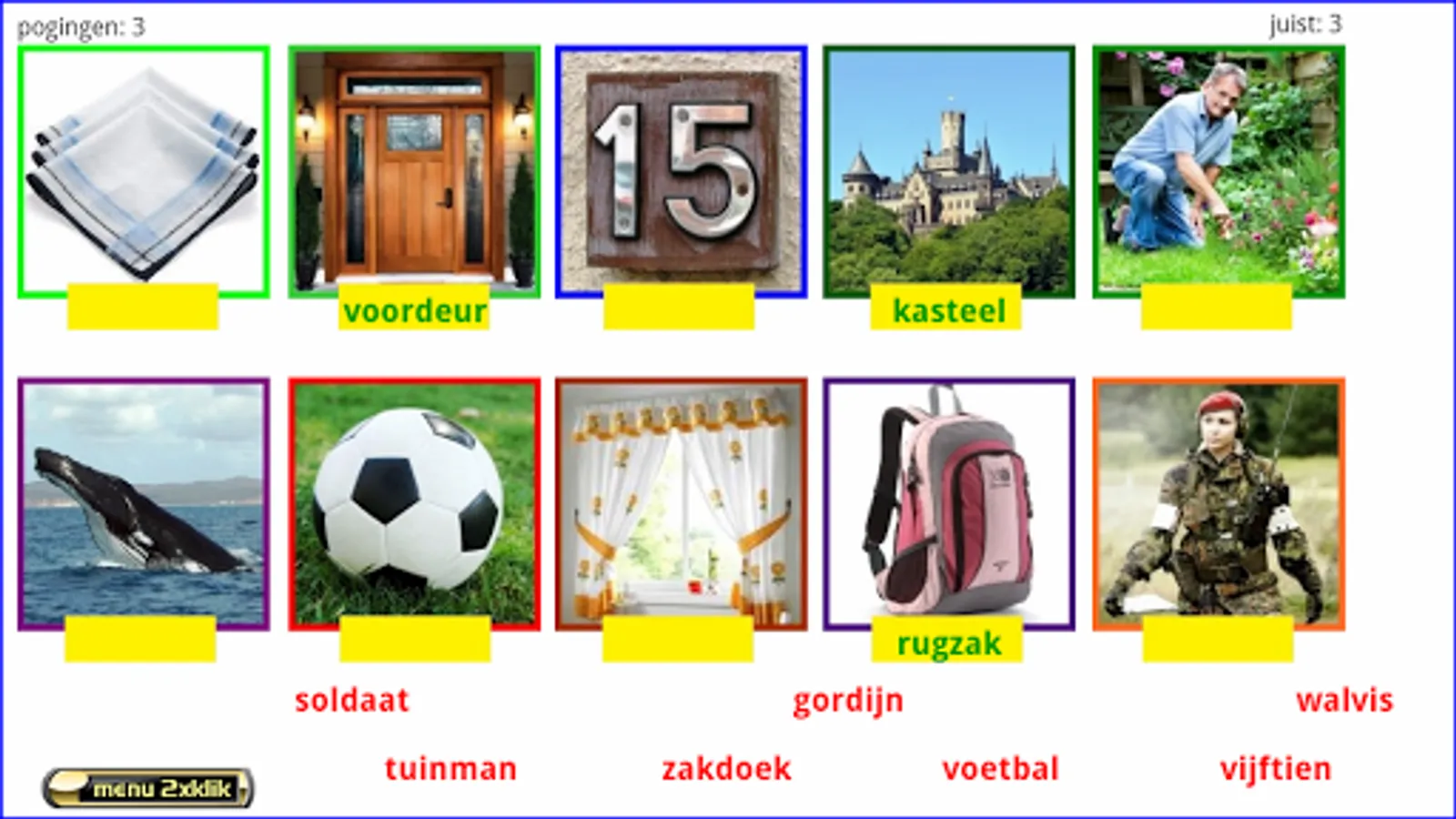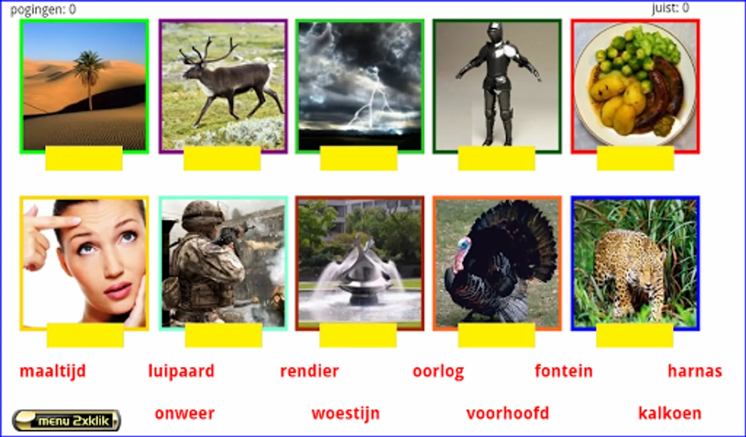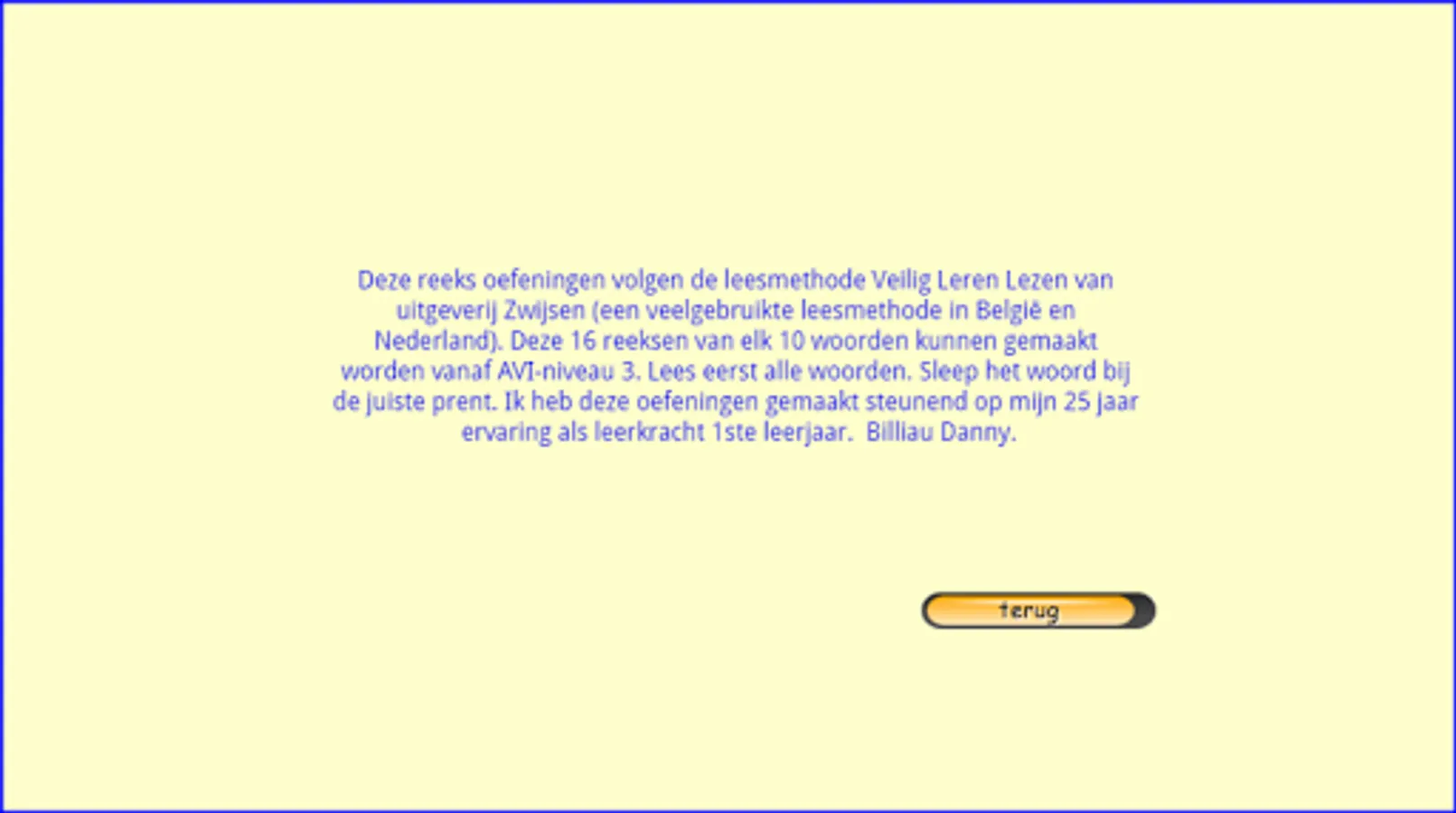 This series of exercises follows the reading method Safe Learning to Read from Zwijsen publishers (a widely used reading method in Belgium and the Netherlands). These 16 sets of 10 words each can be made from AVI level 3. Read all the words first. Drag the word to the correct picture. I made these exercises based on my 25 years of experience as a 1st grade teacher. Drag and drop exercise. Works best on tablets.