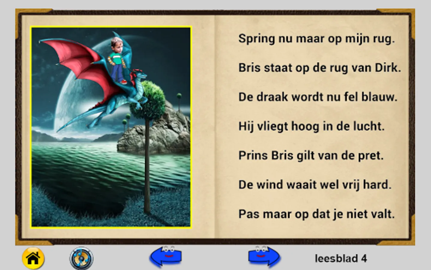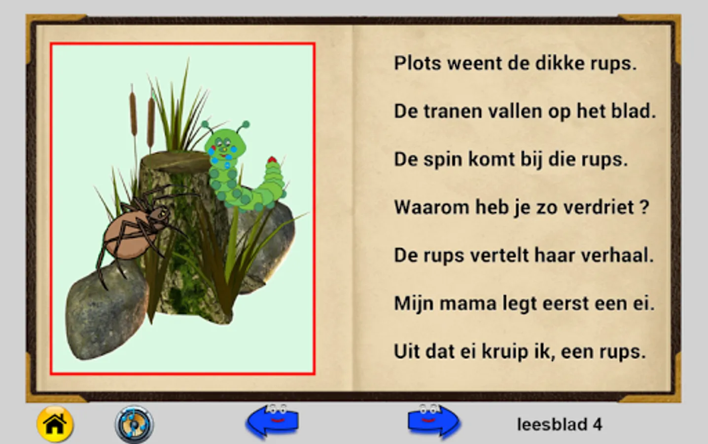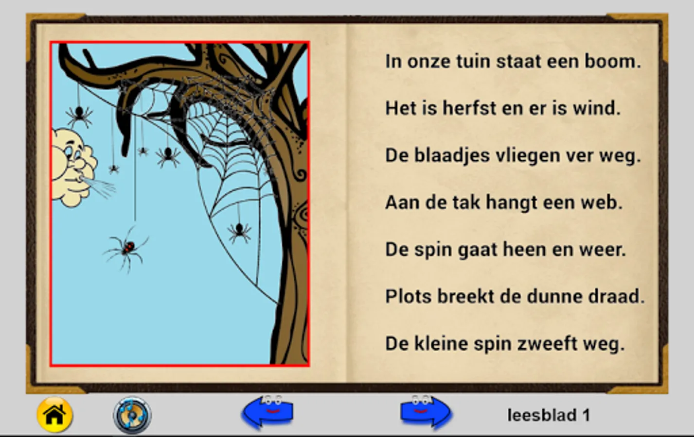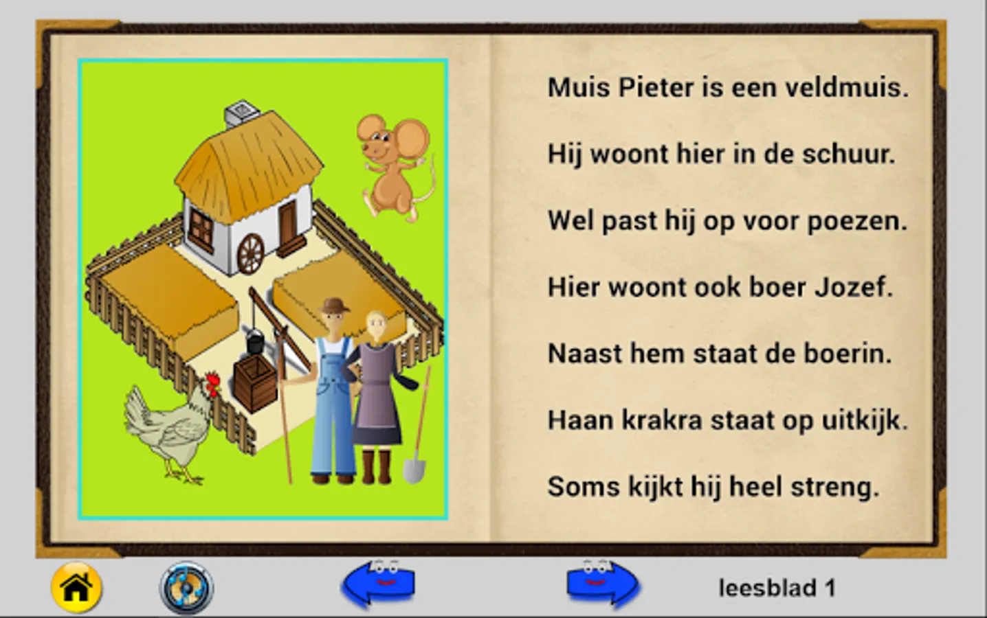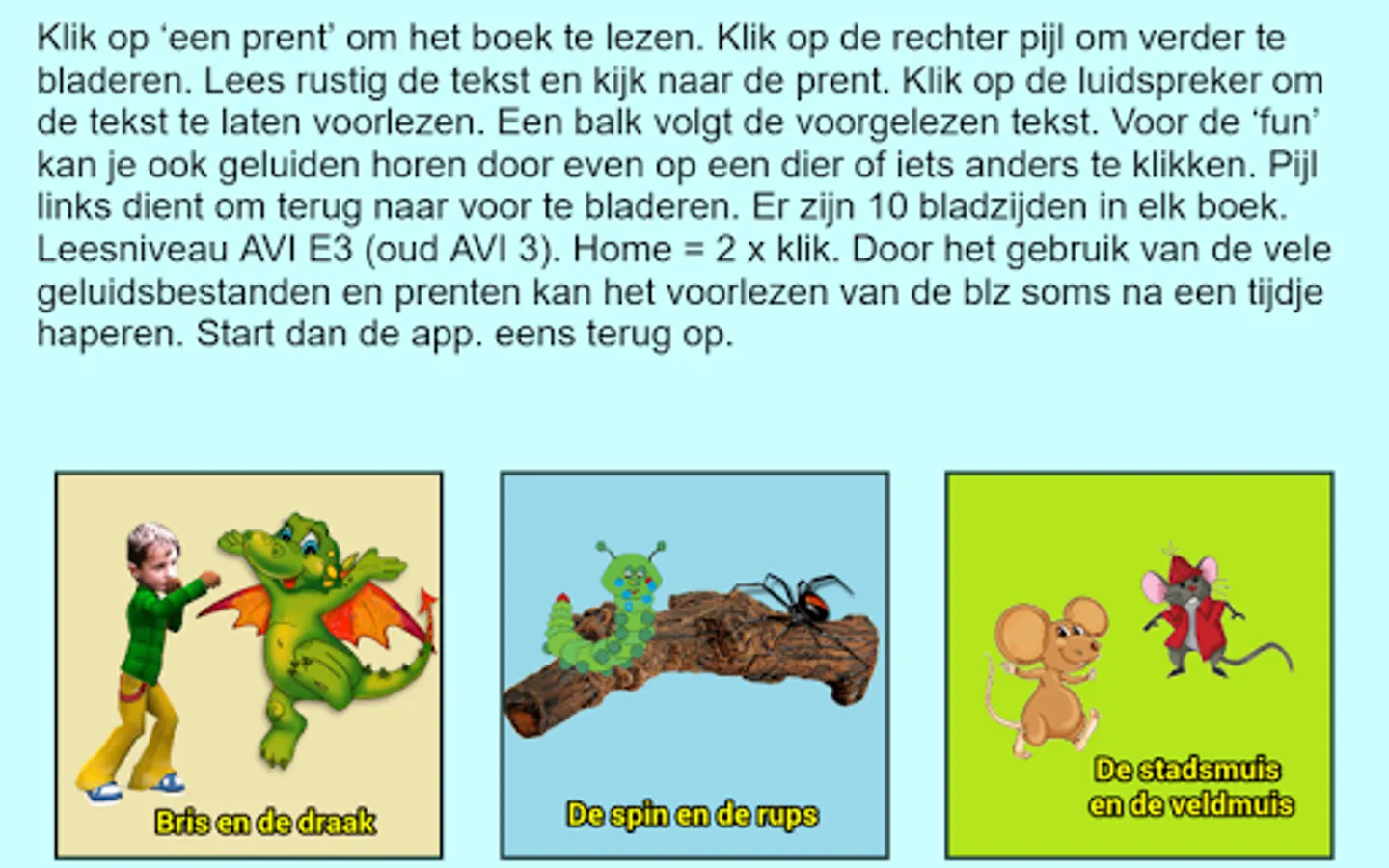This flip flap booklet contains three stories. AVI level E3 (old AVI 3). Click 'story' to read the book. Click the right arrow to scroll through. Read quietly the text and look at the picture. Click on the speaker to make the text read. A beam follows the text read aloud. For the fun you can hear sounds by just clicking on an animal. Left arrow is used to scroll back to the front. There are 10 pages in this book. In the end you can click on "return" to restart.