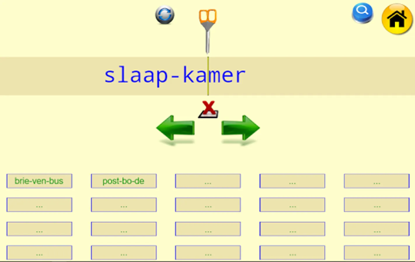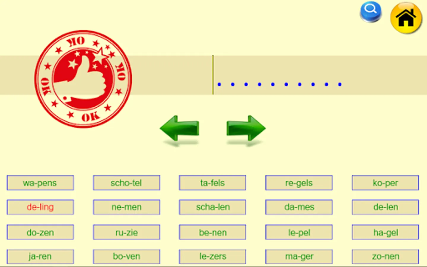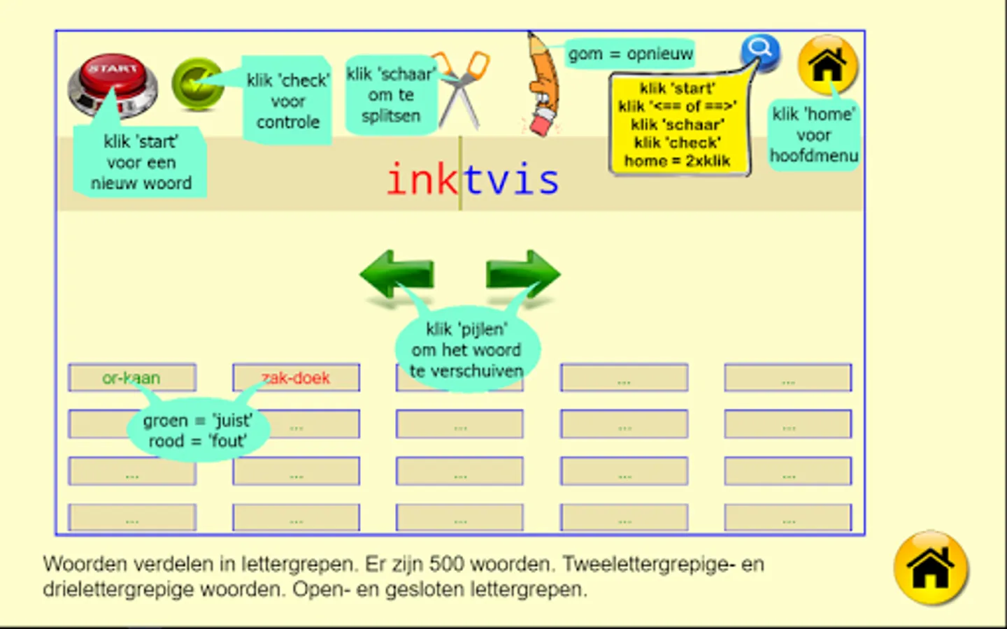 Can divide words into syllables. Two-syllable words with closed syllables. Two-syllable words with open syllables. Three-syllable words with open and closed syllables. There are a total of 20 sequences with 25 words each (500 words in total). Auditory support.