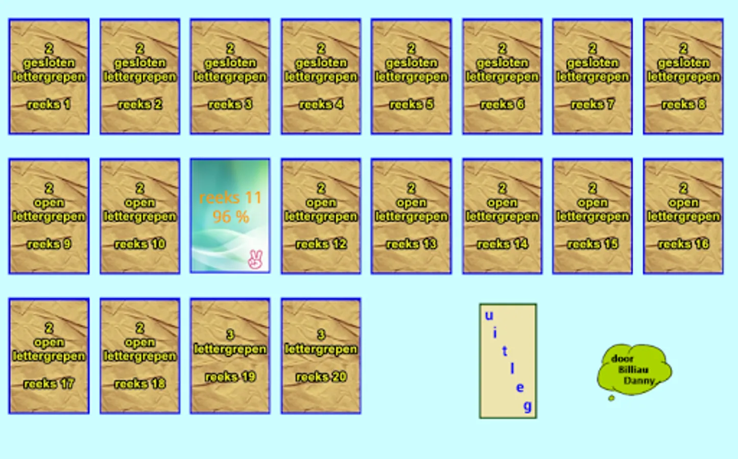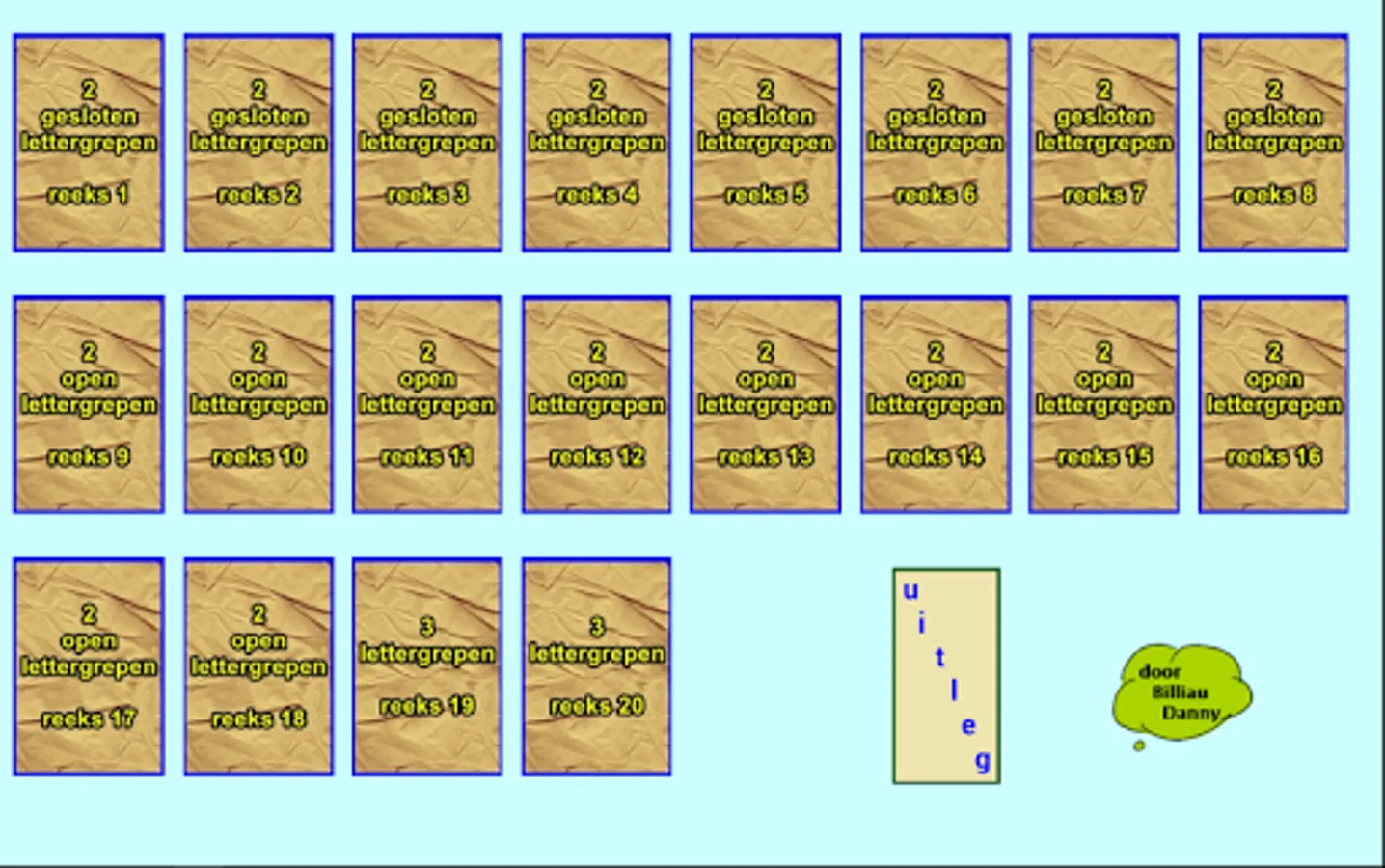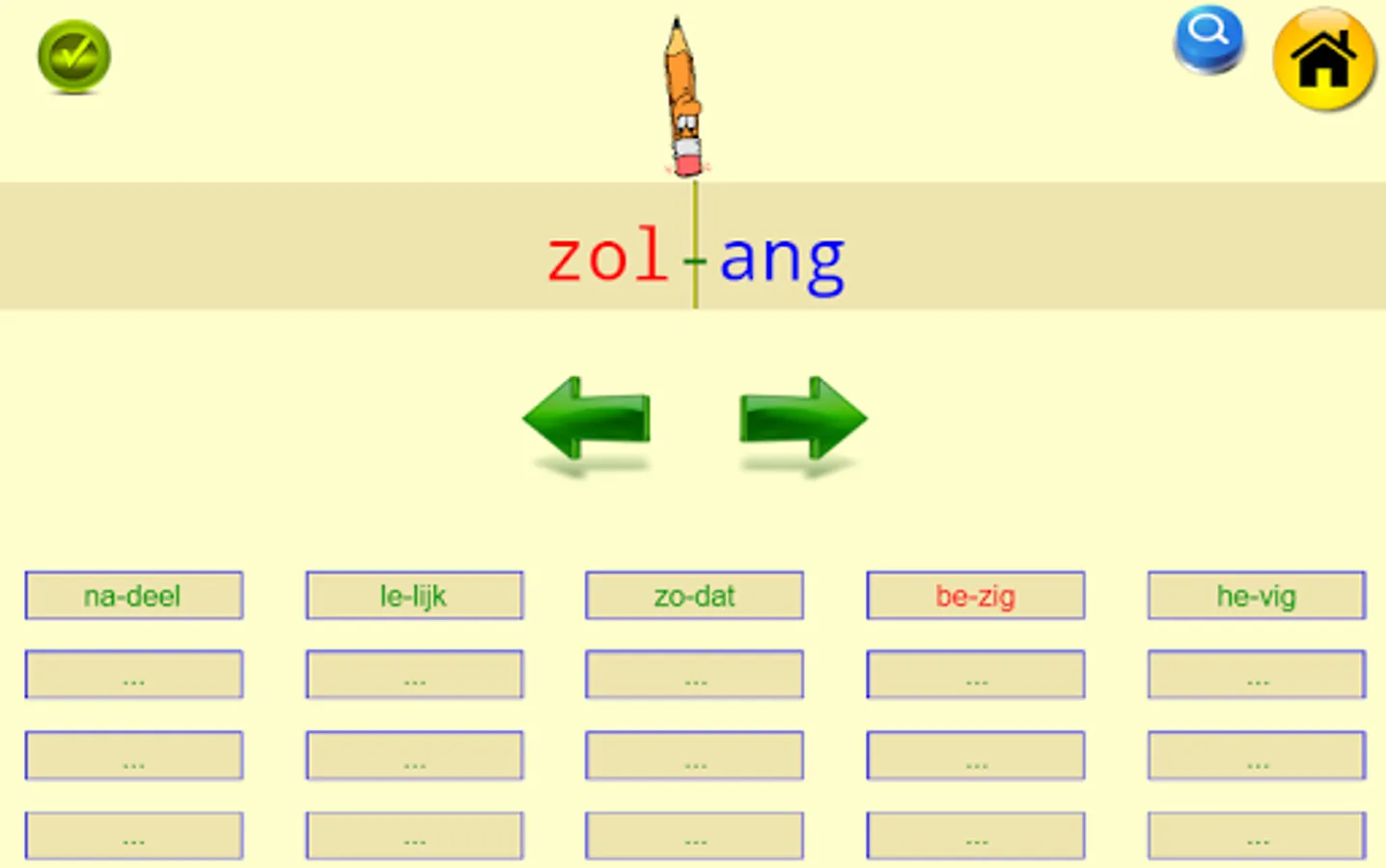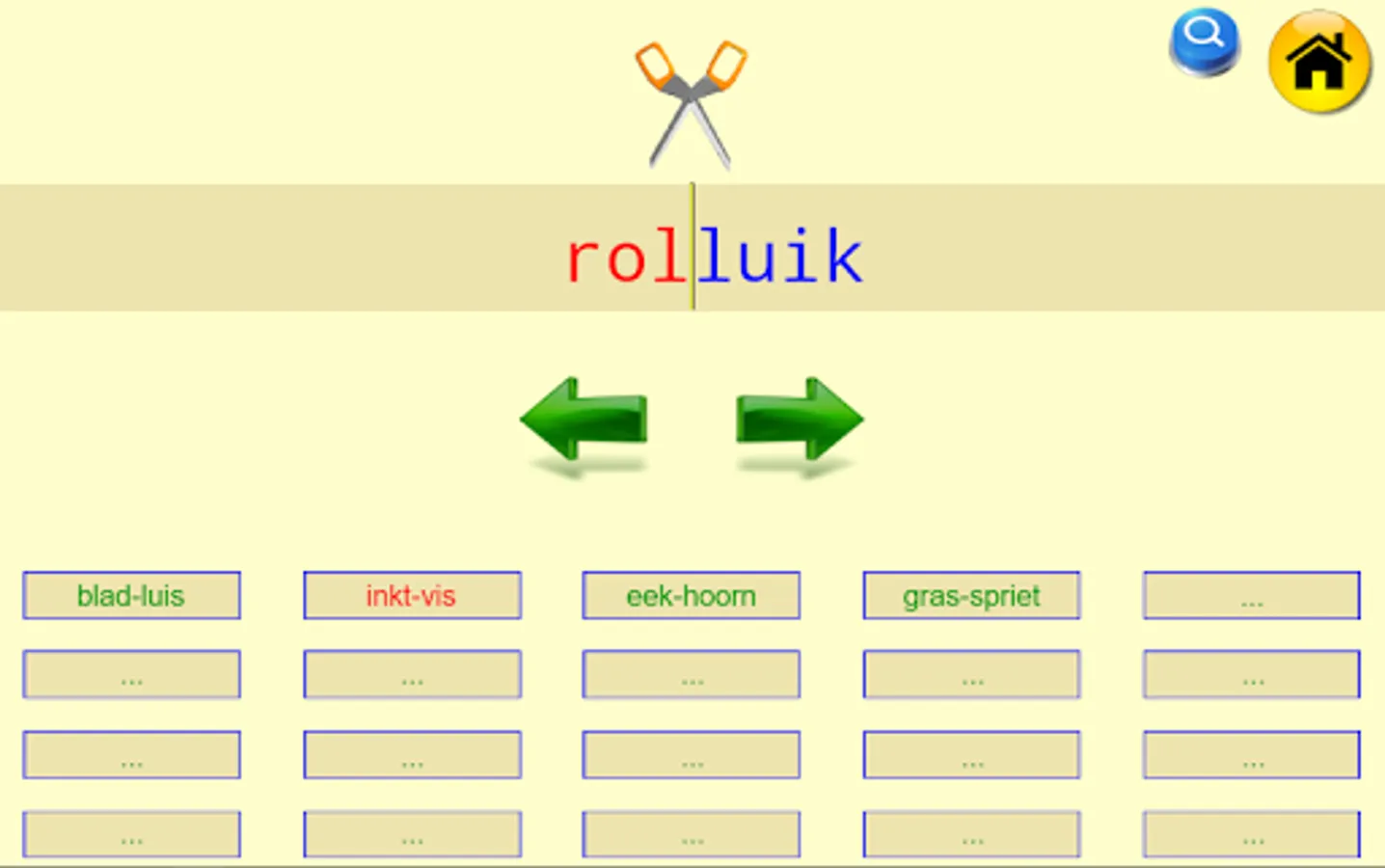 Can divide words into syllables. Two-syllable words with closed syllables. Two-syllable words with open syllables. Three-syllable words with open and closed syllables. There are a total of 20 sequences with 25 words each (500 words in total). Auditory support.