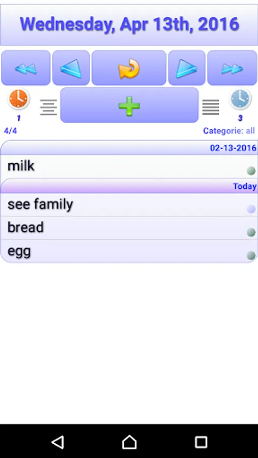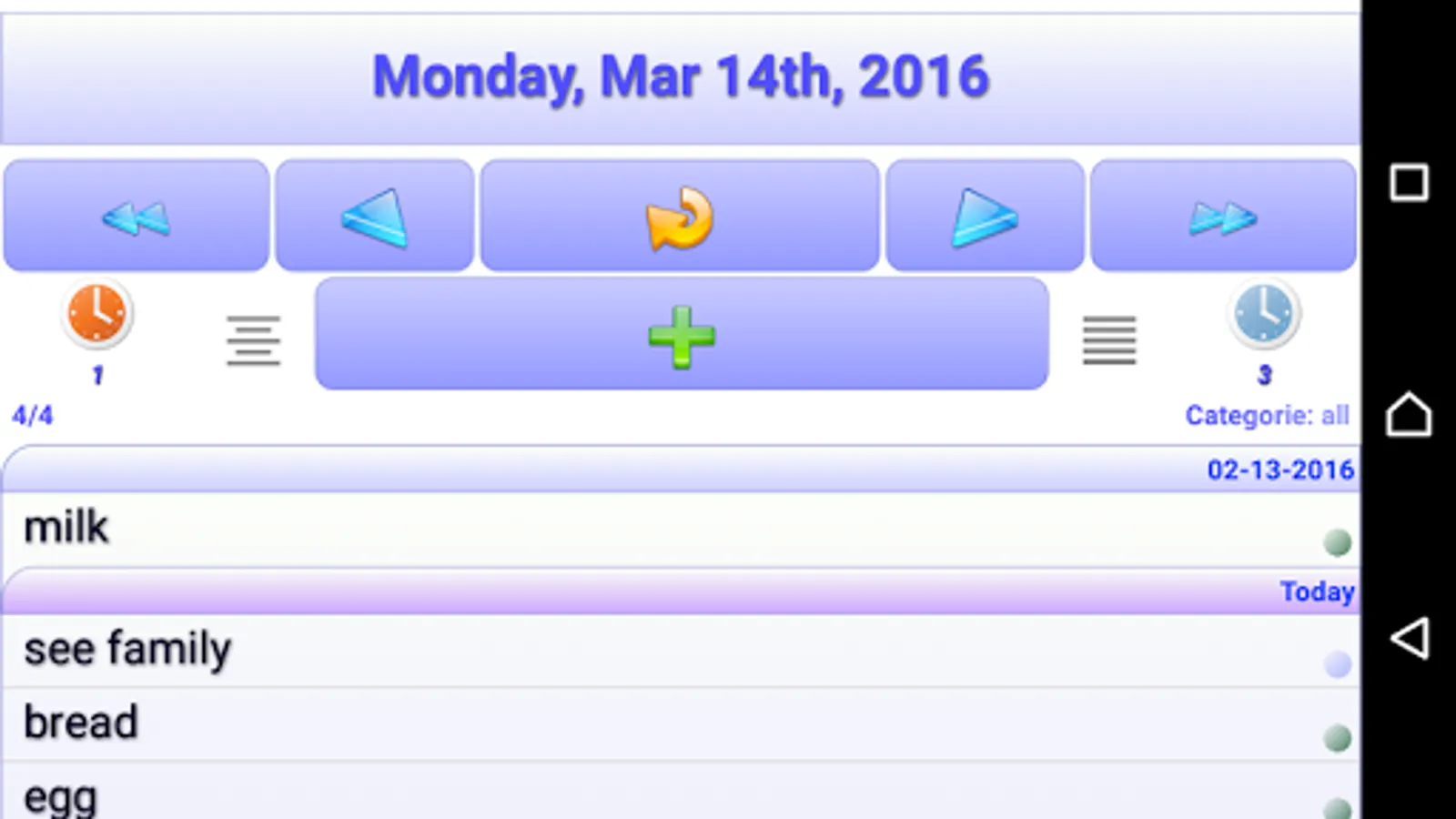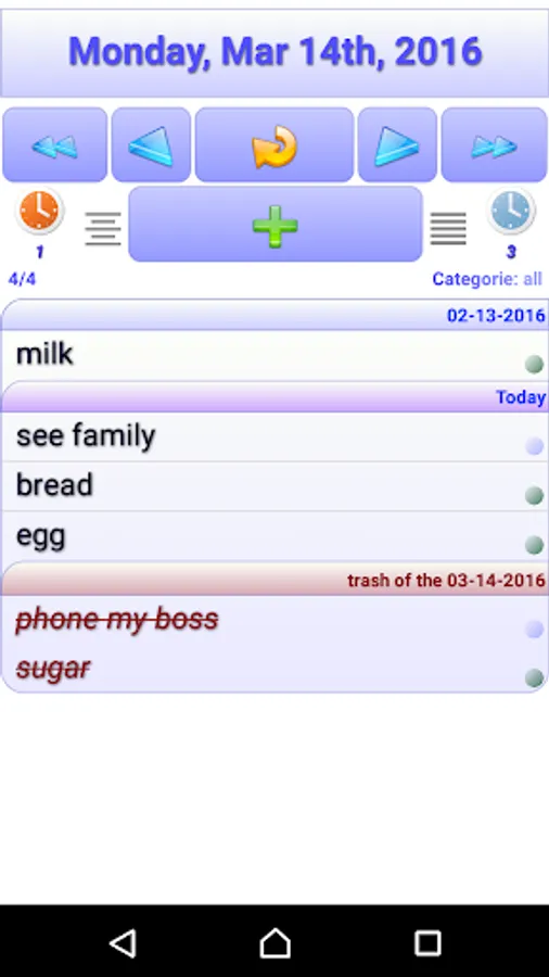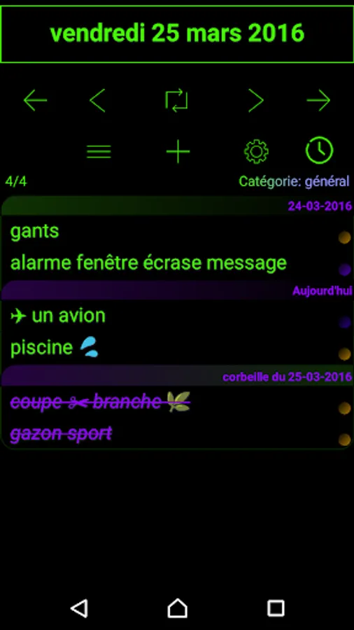 Create a note in time, enter a description, place it in the trash of the day, empty the bins by clicking on its title. Change the notes or descriptions, be guided by the daily alerts, create categories (shopping, pro ...).