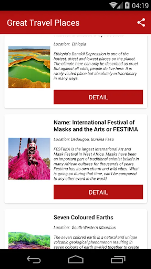 Great Travel Places will show you: natural wonders, best of the best hotels, stunning architecture and monuments, unique restaurants and bars, cheerful and extreme festivals, amazing waterfalls and lakes, out of the world mountains and rivers, alien caves, and gigantic sculptures, and colorful beaches, jaw dropping bridges and parks.