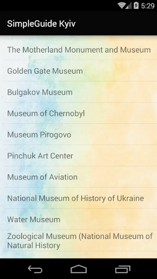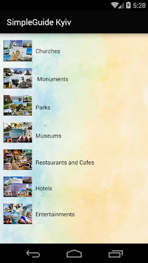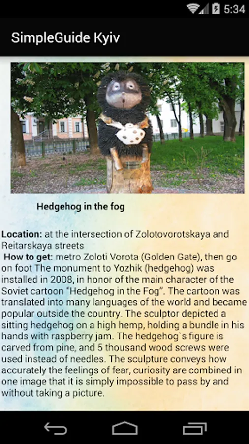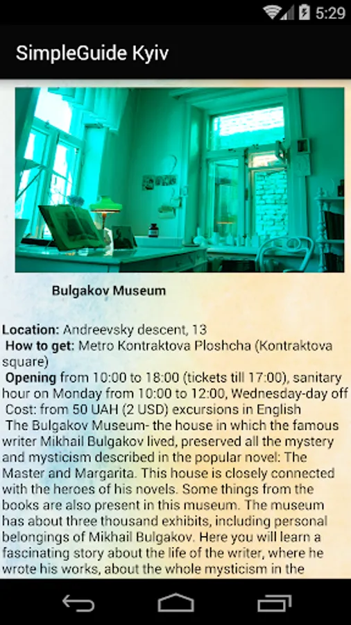The application allows you to find out information about the most interesting places and their location, as well as see the photos, read the description and find out the prices, if the entrance fee is charged.