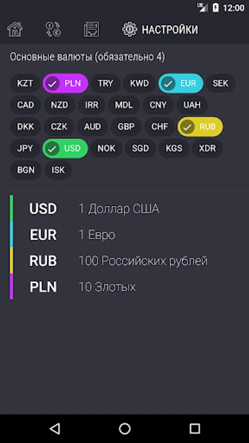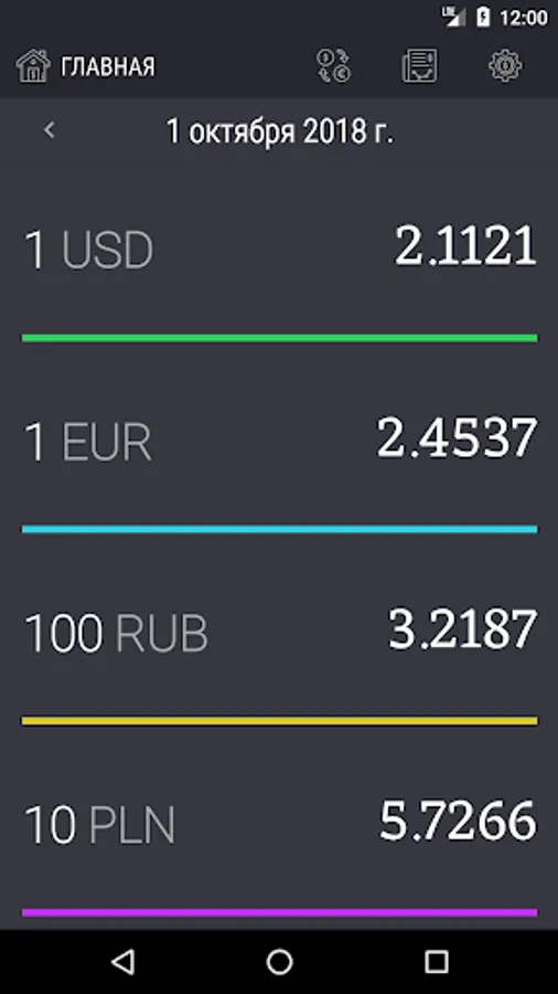 For convenience, you can configure four main currencies that will be displayed on the main tab, as well as in the converter. On the main screen of the application you can find out the rate of major currencies for a certain number, as well as go to the detailed information about the currency - you can see the graph of currency changes for the week, month and year. Here you will see the exchange rate of the Belarusian ruble to a given currency for yesterday, today and tomorrow, as well as the difference in the rate compared to the previous day.