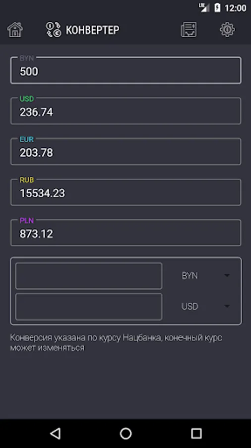 In this application, you can find out the current exchange rate of the Belarusian ruble against foreign currencies.