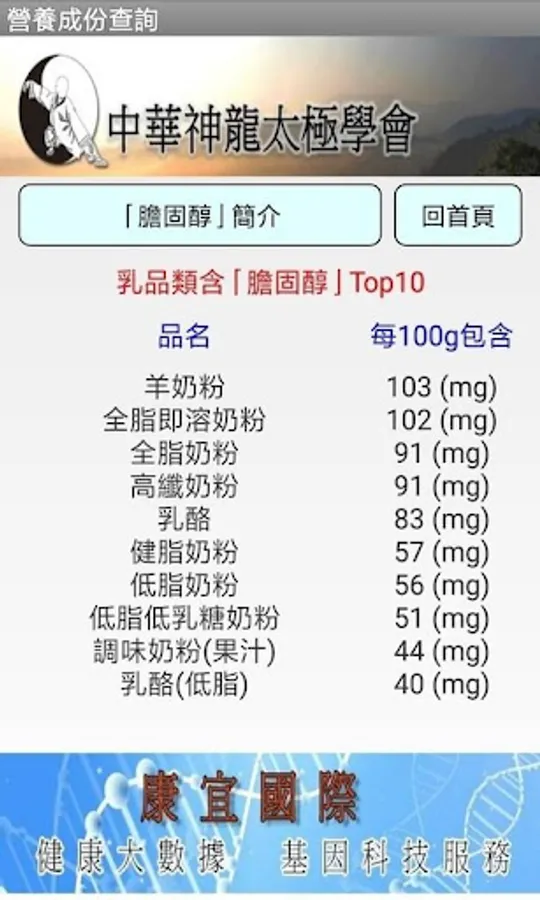 本程式讓您簡單就能查出各種食物的營養成份,並且有食物的各項成份排行榜,方便您日常飲食規劃用。