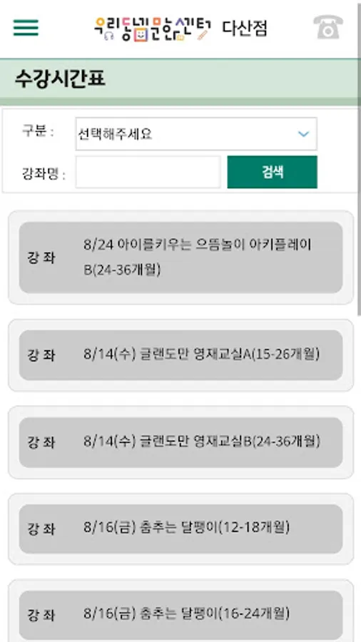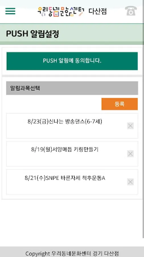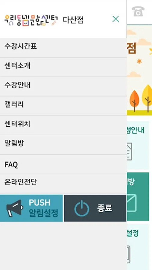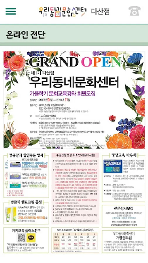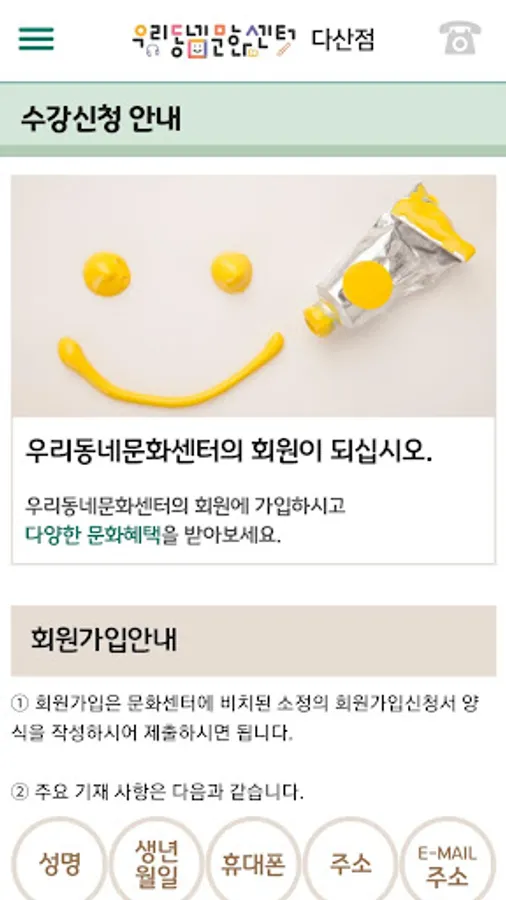 우리동네문화센터 다산점에서 제공하는 강좌안내, 수강시간표, 센터 안내, 회원 PUSH 알림서비스를 확인하실 수 있습니다.