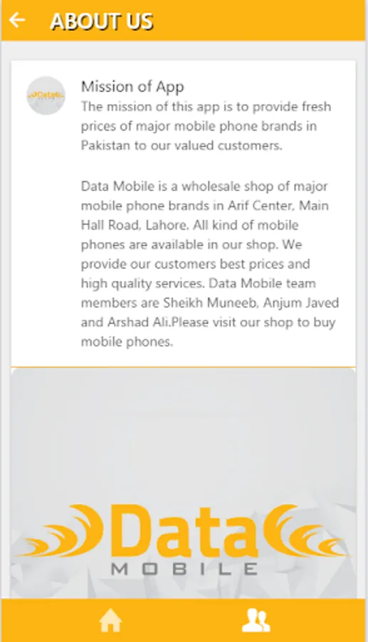 Data Mobile is a wholesale shop of major mobile phone brands in Arif Center, Main Hall Road, Lahore. All kind of mobile phones are available in our shop. We provide our customers best prices and high quality services. Data Mobile team members are Sheikh Muneeb, Anjum Javed and Arshad Ali.Please visit our shop to buy mobile phones.