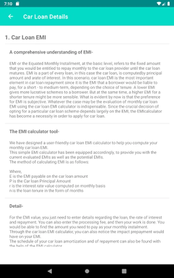 Prepayment evaluation - The car loan EMI calculator tool also allows you to understand the influence of prepayment on your car loan EMI. You just need to provide the input for the frequency and the amount of prepayment along with the prepayment charges. The EMI calculator would provide you with the EMI instantly.