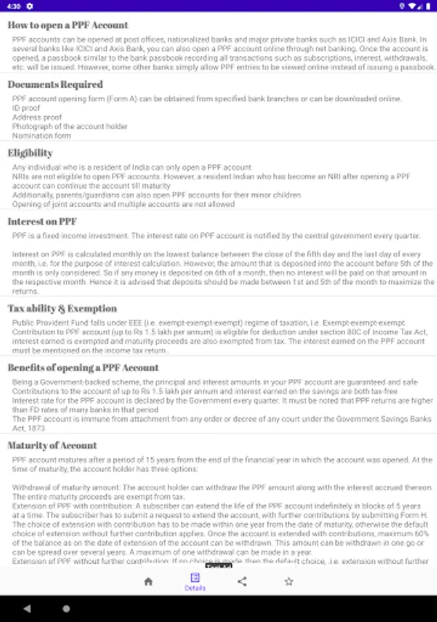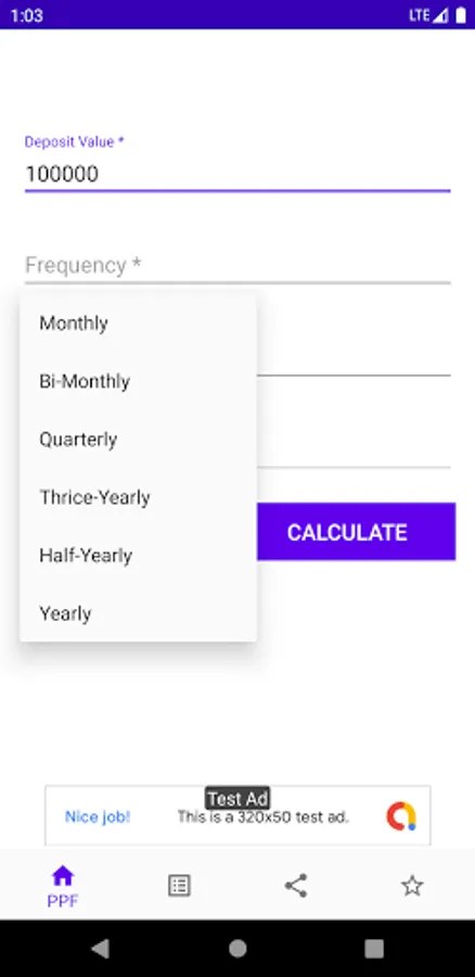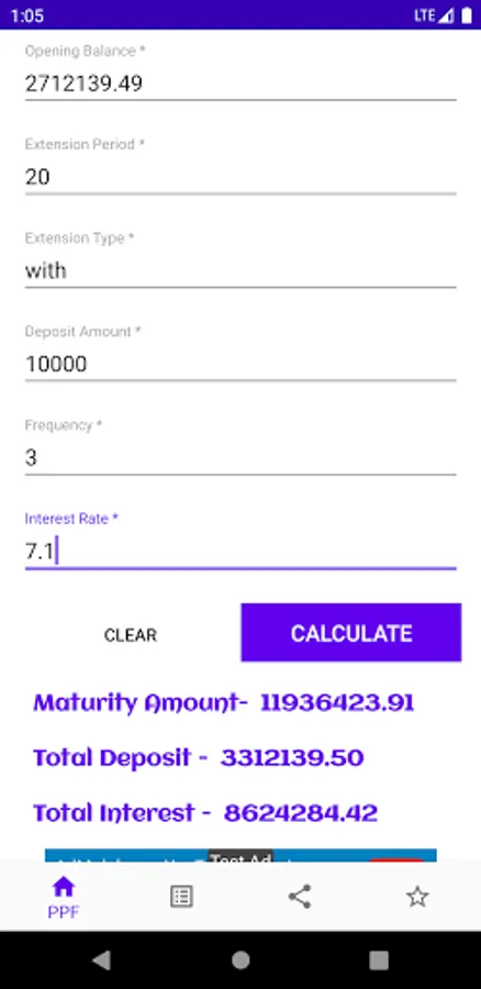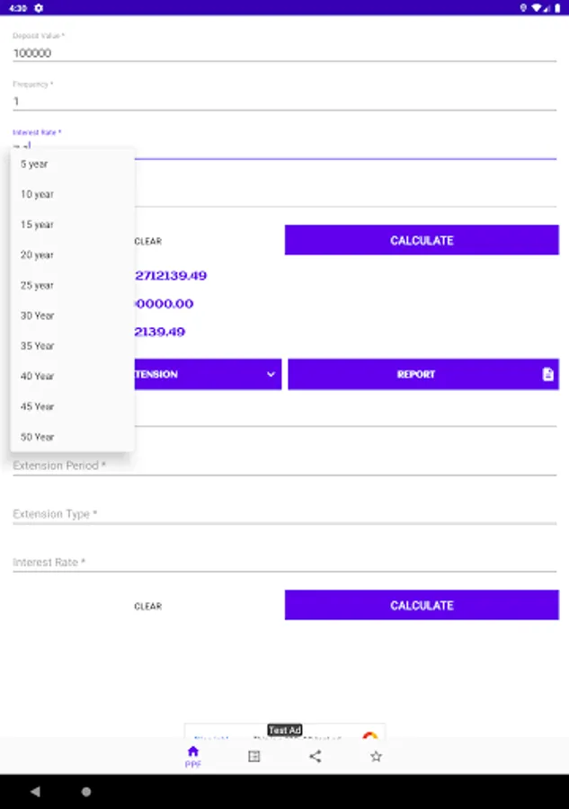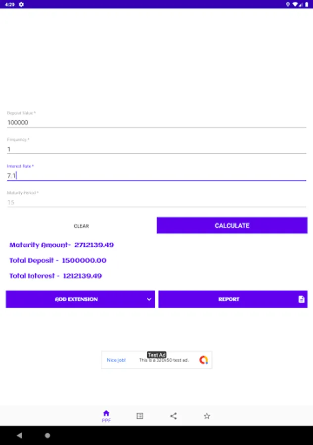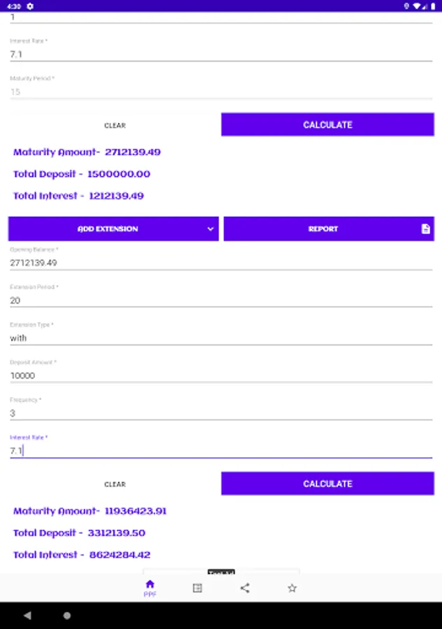 PPF Calculator is a simple app for PPF related calculations. If you're saving/investing money under PPF scheme, then you may find this little tool useful for doing some calculations e.g interests earned over the period or how your investment grows over the years, final maturity amount etc. Just enter the yearly deposit amount and it calculates (also show you the table ) your interest/balance for the next 15 financial years.