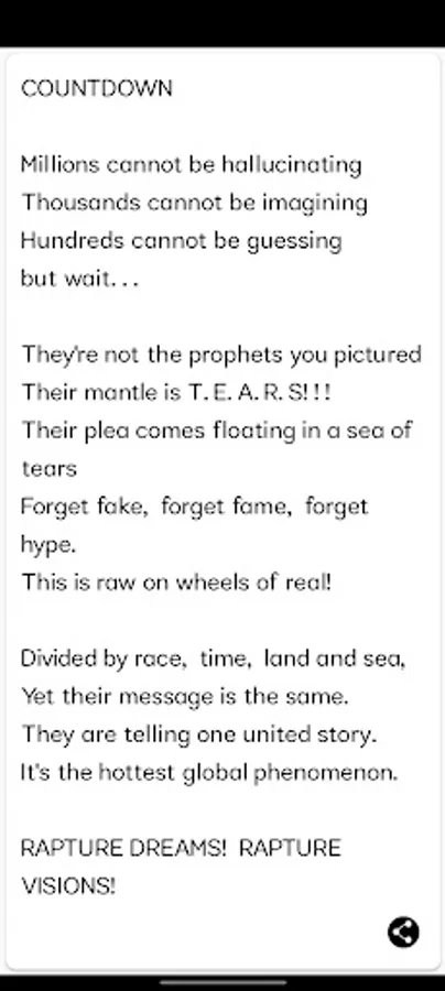 🔟 This book is a personal testimony sparked by my own dreams. The urgency in my first Rapture dream led me to seek confirmation online. Well, I realized I was in good company of end-time dreamers and friends of God. I have gathered extensive testimonies, prophetic insights, and biblical teachings to help you navigate these times with clarity and faith. It is a free resource designed to equip and encourage all who hunger for truth and hope. Please share. In my dream I sensed great demonic HESITATION TO SHARE THE RAPTURE WARNING. Overcome your hesitation and share. This Time it will not fail. Be Vocal. Be Fearless!