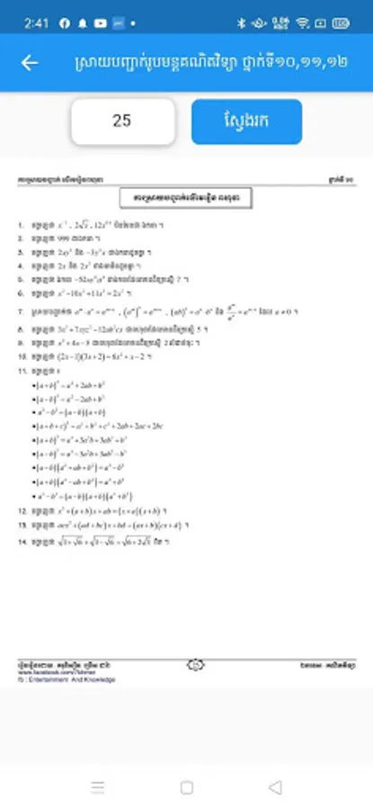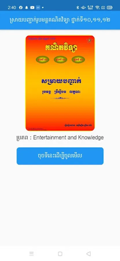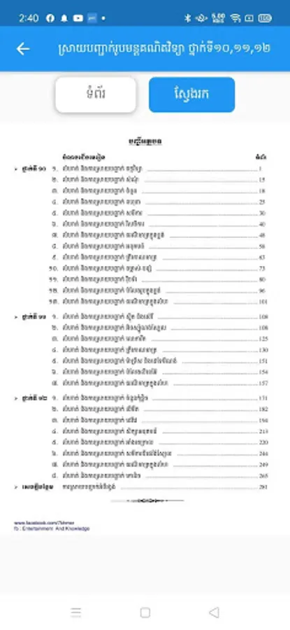 ស្រាយបញ្ជាក់រូបមន្តគណិតវិទ្យាថ្នាក់ទី10 11 12។ ល្អសំរាប់ប្អូនៗទី10 11 12 ដែលចង់យល់ច្បាស់ពីការស្រាយបញ្ជាក់រូបមន្ដគណិតវិទ្យា។ ខំរៀនឡើងប្អូនដើម្បីអនាគត់ល្អ។ ជាពិសេសប្អូនទាំងអស់គ្នាអាចមើលសៀវភៅនេះបានដោយមិនចាំបាច់ប្រើប្រាស់អុីនធឹណែត។
