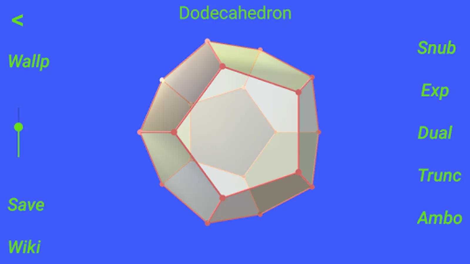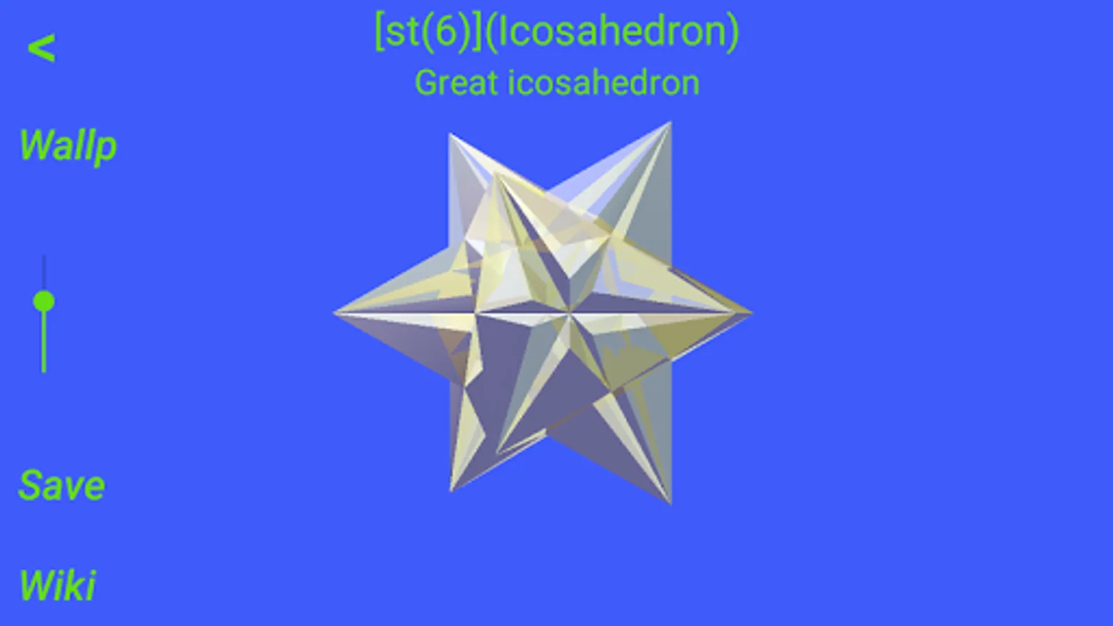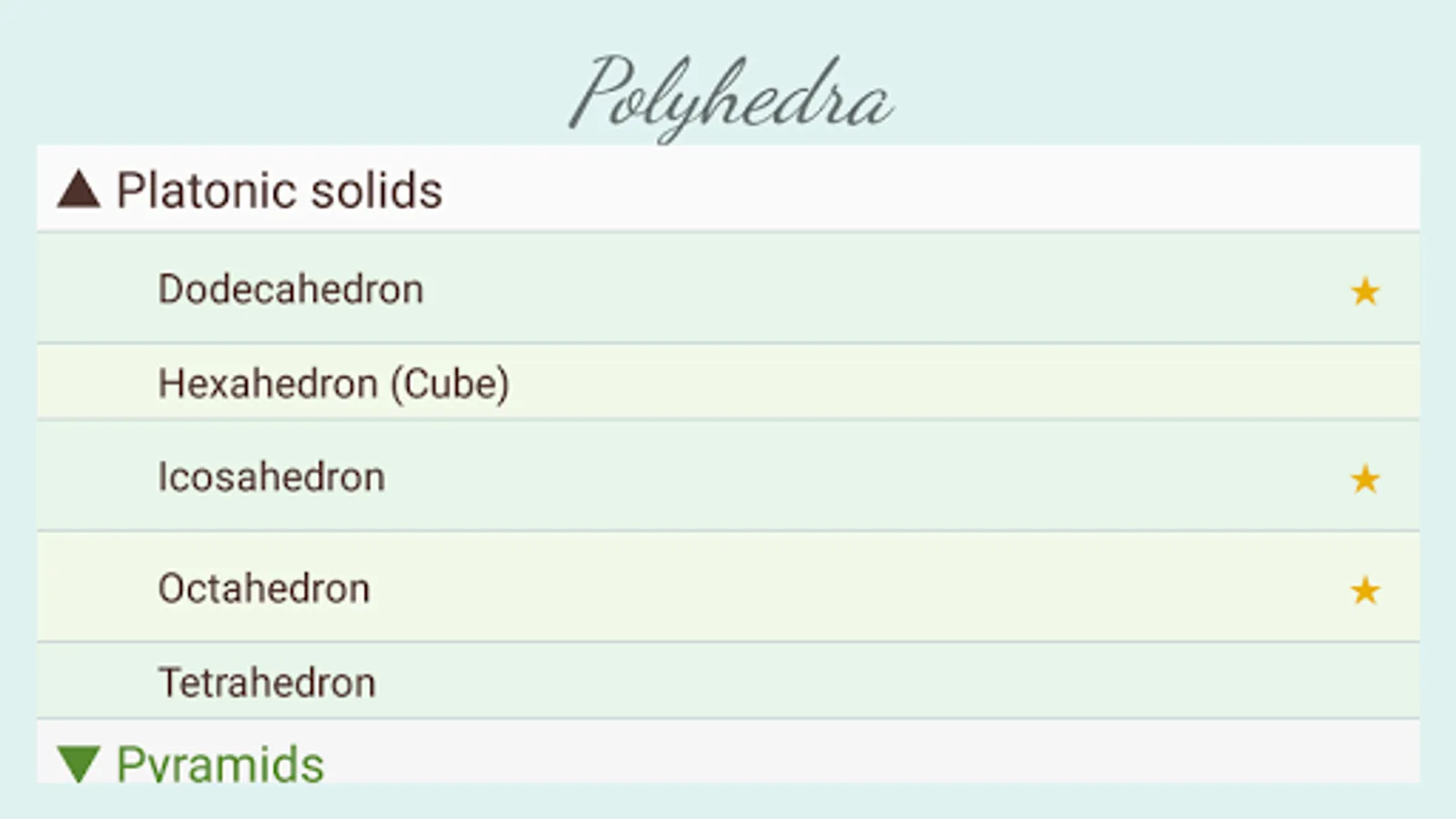 "Polyhedra" shows the best known solids: prisms, pyramids, regular, Archimedean, Catalan, Kepler-Poinsot, Johnson polyhedra and some stellations. They are represented graphically and you can interact with them and set one or more polyhedra as wallpaper. If you access internet, you can also call up the corresponding Wikipedia page.