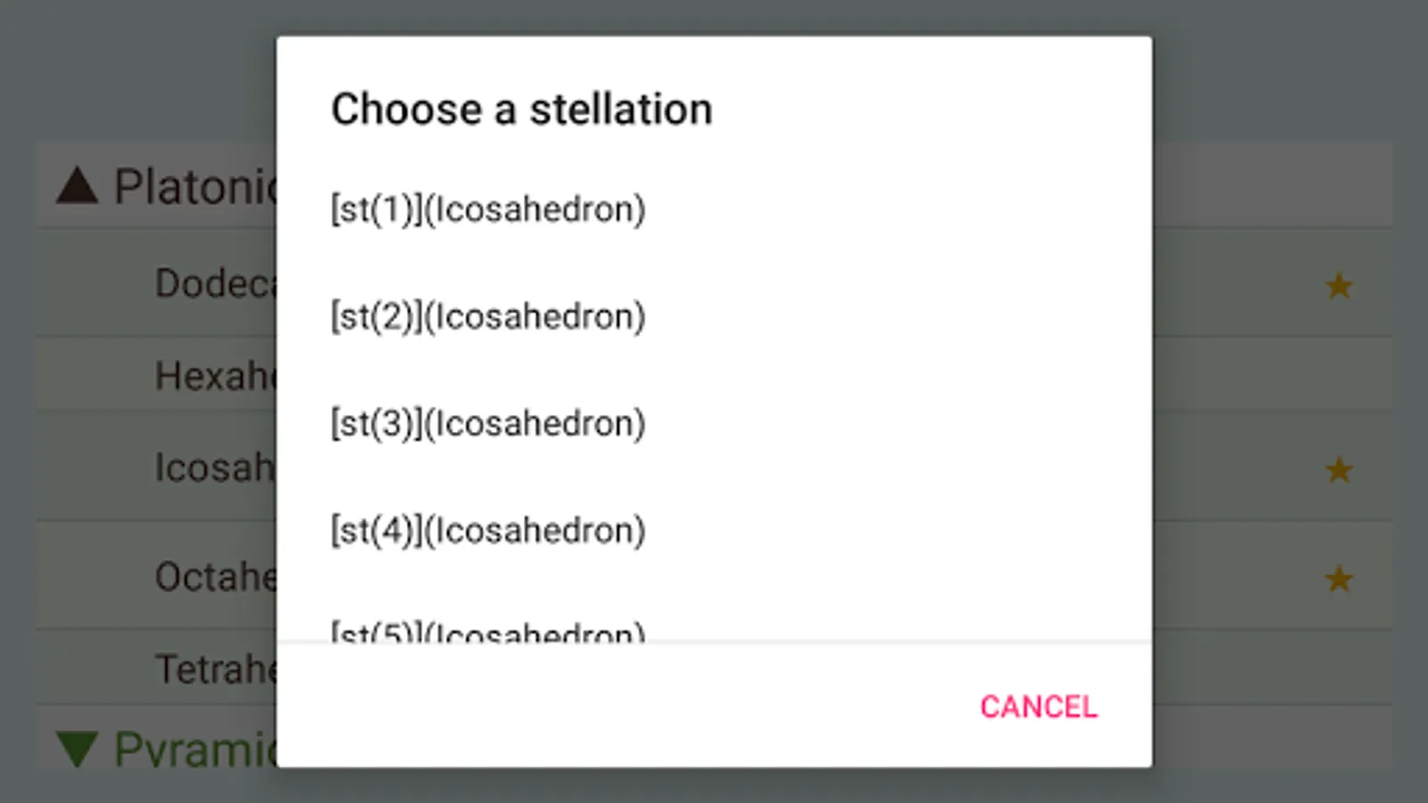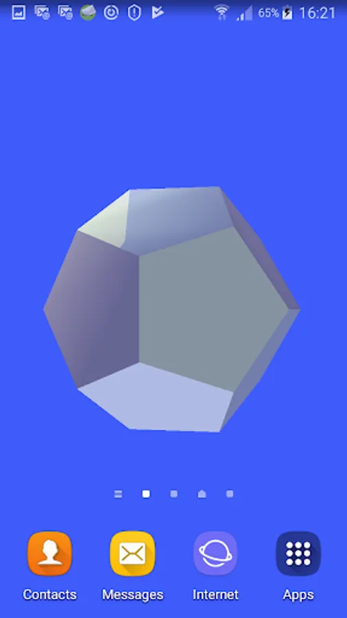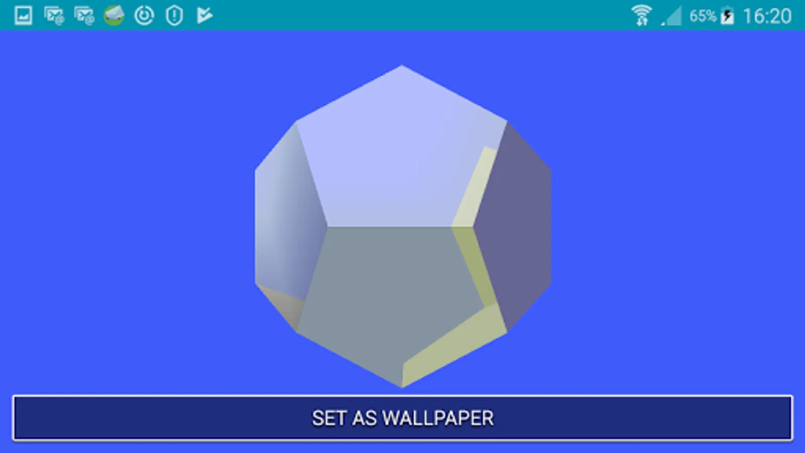 "Polyhedra" shows the best known solids: prisms, pyramids, regular, Archimedean, Catalan, Kepler-Poinsot, Johnson polyhedra and some stellations. They are represented graphically and you can interact with them and set one or more polyhedra as wallpaper. If you access internet, you can also call up the corresponding Wikipedia page.