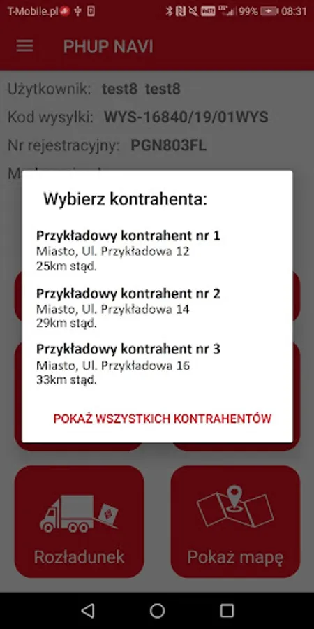 * UNLOADING - Unloading the goods is very simple, you click the button, the application searches for the three closest contractors and you choose which contractor you are currently at.