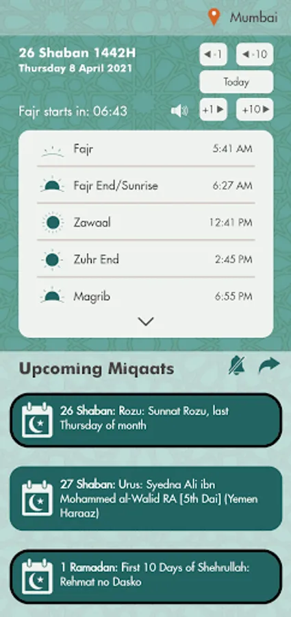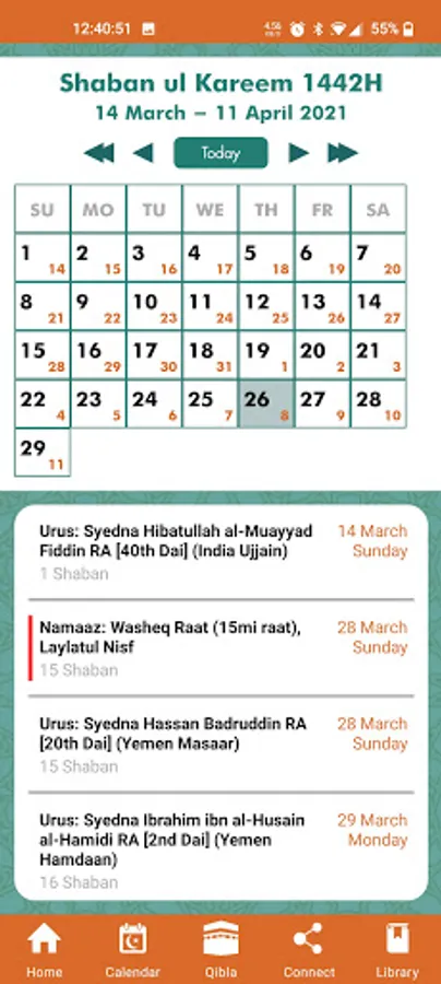 • Hijri calendar : Misri calendar with corresponding Gregorian calendar dates; complete list of all observable Miqaats (e.g. Lailatul Qadr) linked to Amal Details including wasila and waaz, niyyats, doas, qasidas, marsiya on FatemiDawat.com, notifications option