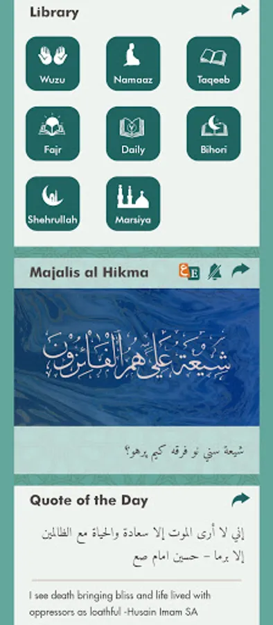 • Majalis al Hikma (Wisdom Seminars) : Updates in all three languages – Dawat ni Zaban, Arabic and English weekly topics addressed by Syedna Taher Fakhruddin TUS, notifications option