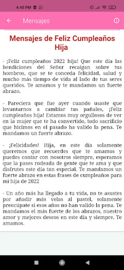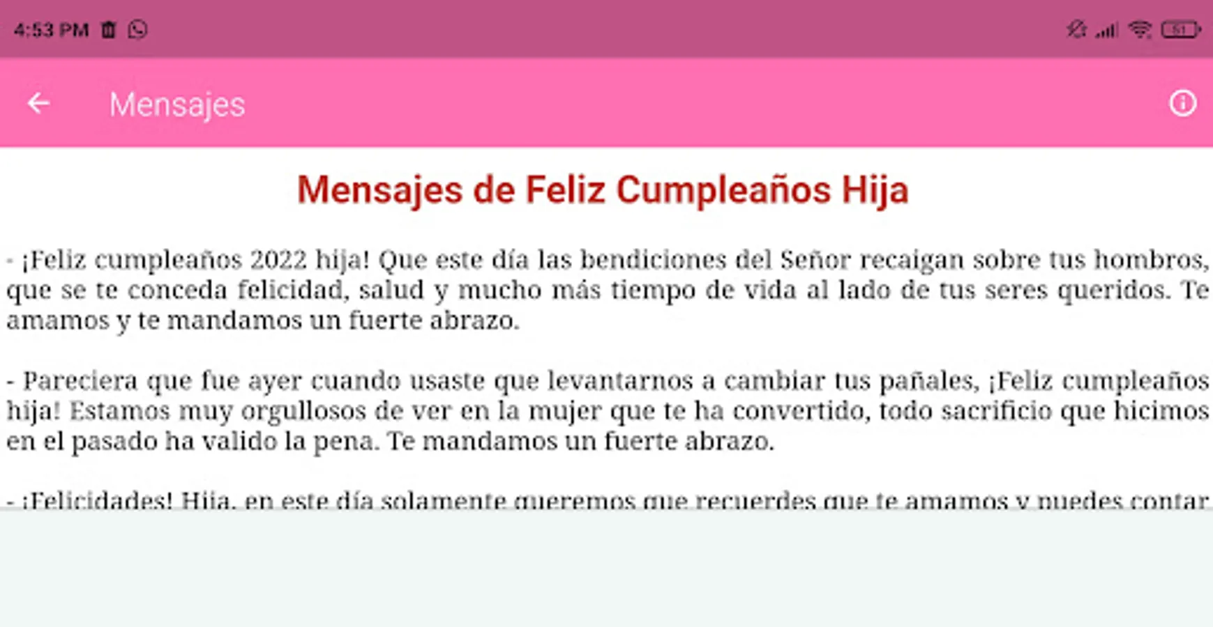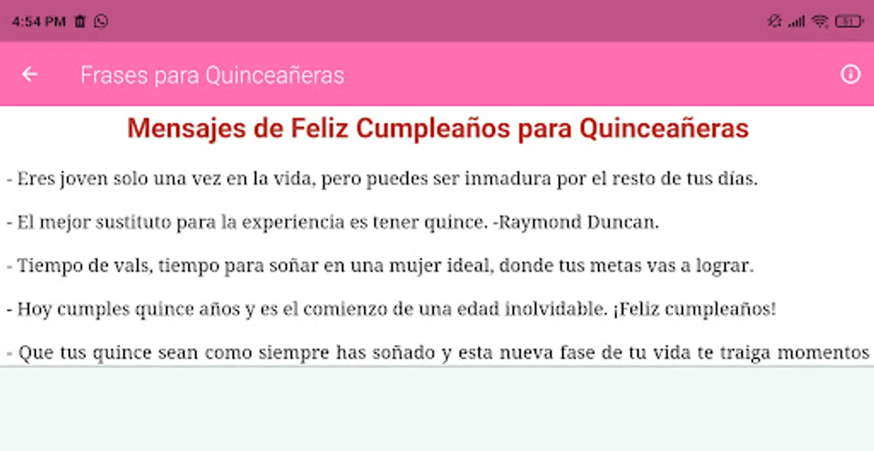In this application you will find the best phrases of encouragement for your daughter, niece, aunt, friend and for each lady that you want to dedicate a phrase of congratulations for turning another year, on this memorable day dedicate them, messages of love, appointments for quinceañeras , phrases of thanks for the birthday girl, beautiful quotes for babies, images that contain very emotional words to make her feel loved and important on her day.