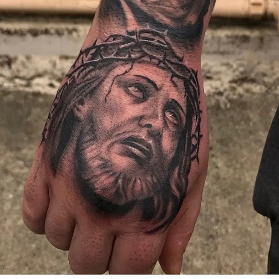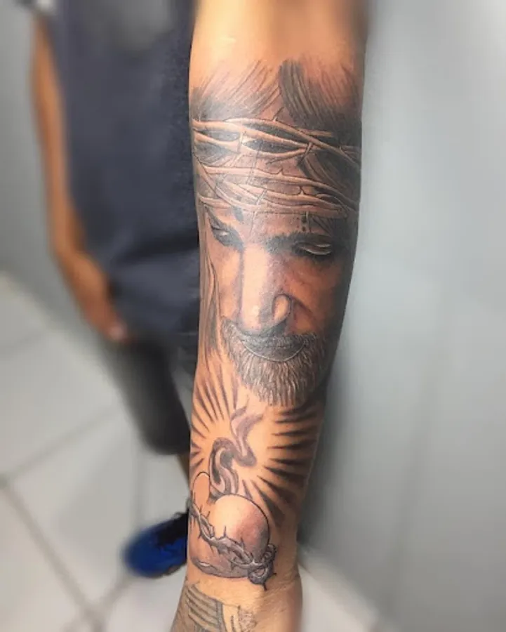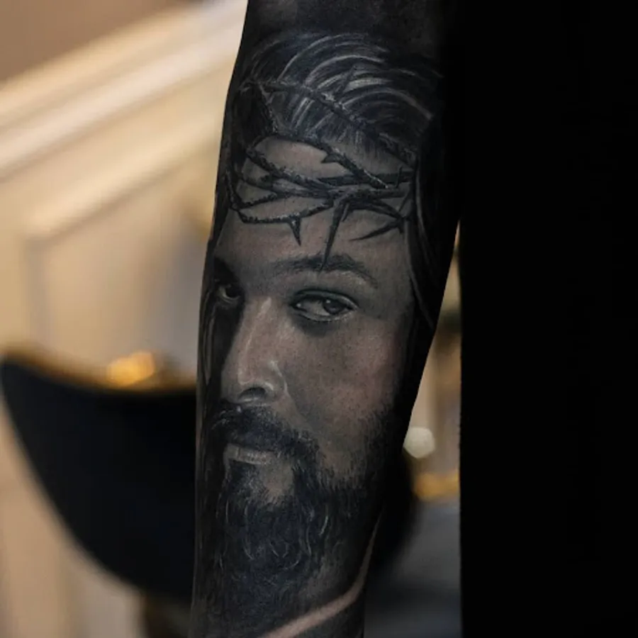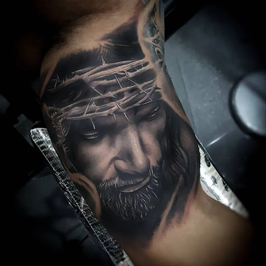 Portraits of Jesus: One popular choice for a Jesus tattoo is a portrait or depiction of Jesus Christ. These tattoos can range from realistic portraits to artistic interpretations of Jesus, capturing his serene expression, compassionate eyes, and iconic features such as a beard and long hair. Some people choose to incorporate elements like a halo or crown of thorns to further symbolize Jesus' divinity and sacrifice.