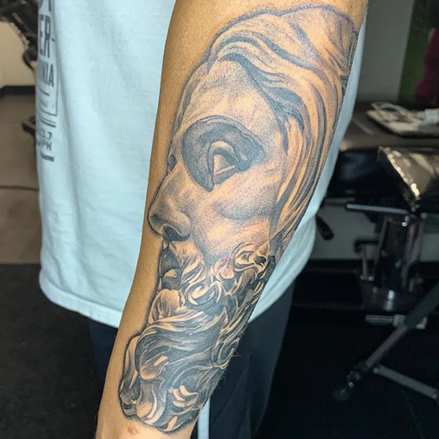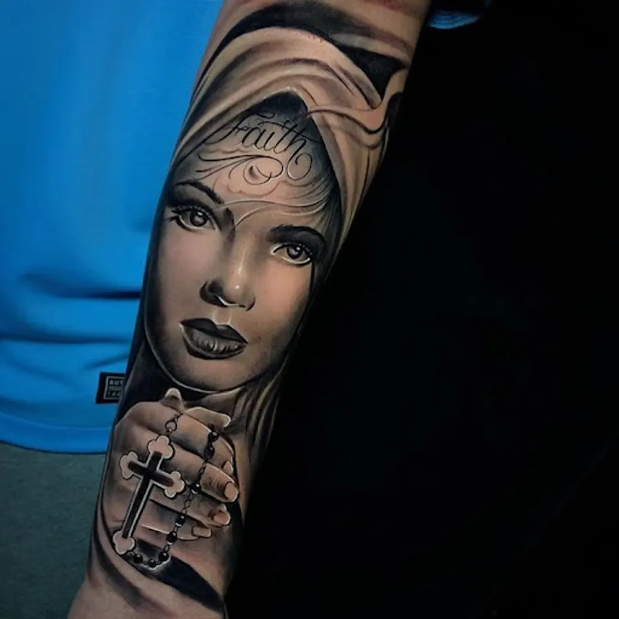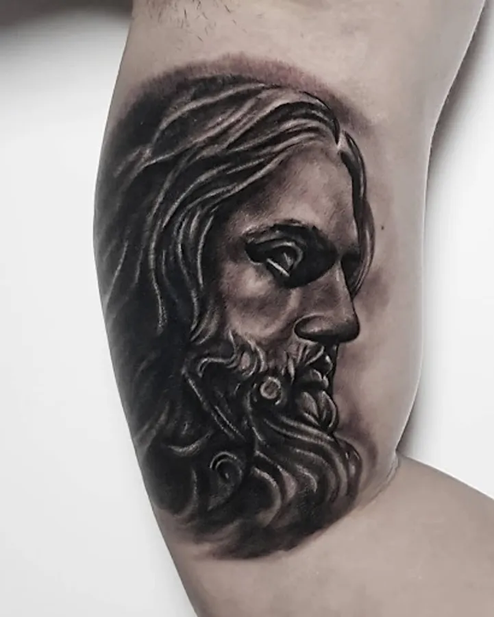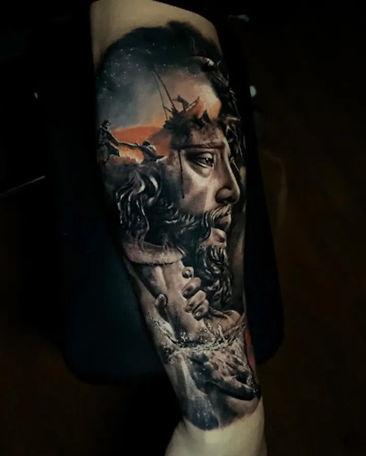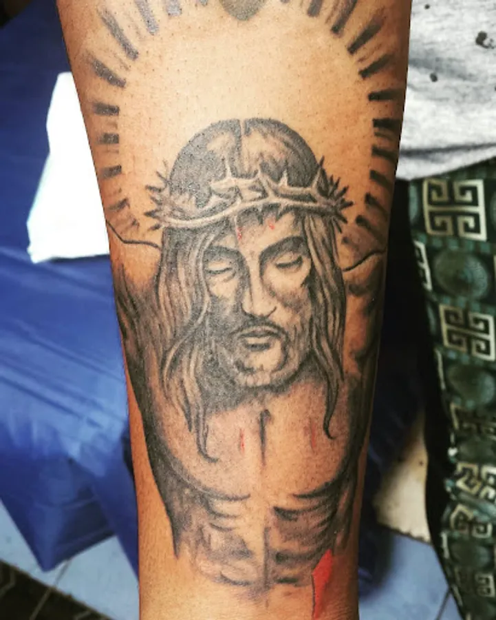 Portraits of Jesus: One popular choice for a Jesus tattoo is a portrait or depiction of Jesus Christ. These tattoos can range from realistic portraits to artistic interpretations of Jesus, capturing his serene expression, compassionate eyes, and iconic features such as a beard and long hair. Some people choose to incorporate elements like a halo or crown of thorns to further symbolize Jesus' divinity and sacrifice.