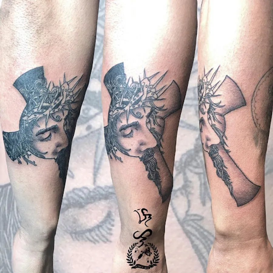 Crucifixion Tattoos: Another common design is a depiction of Jesus on the cross, representing his crucifixion and sacrifice for humanity. These tattoos often include intricate details of the cross, nails, and the crown of thorns. They can be done in various styles, from simple and minimalistic to highly detailed and realistic.