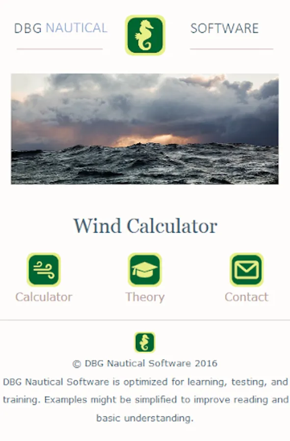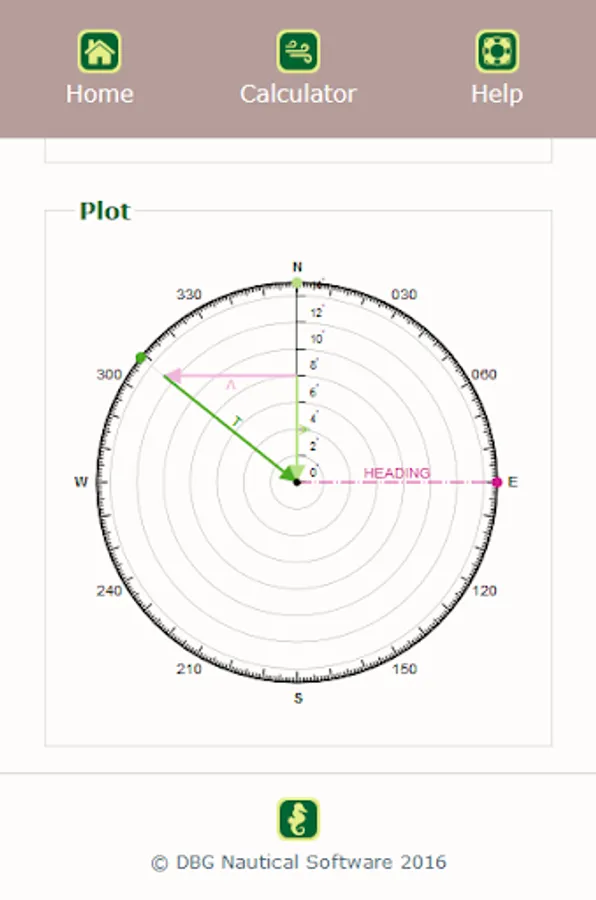 The power of this calculator is the graphical solution or plot, clearly showing how wind vector and ship movement vector are added as a vector sum. Make sure you understand this plotting technique very well.