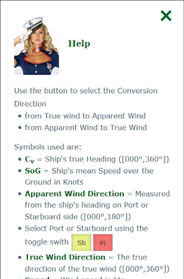 You can also convert true wind to apparent wind. The calculator has a help page which clearly explains all symbols used.