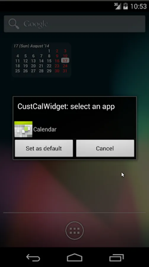Touching the widget opens a calendar app of your choice. You can select this default app when you first launch the widget, and you can change it later starting the related chooser from Launcher.