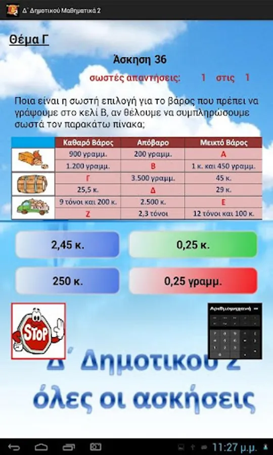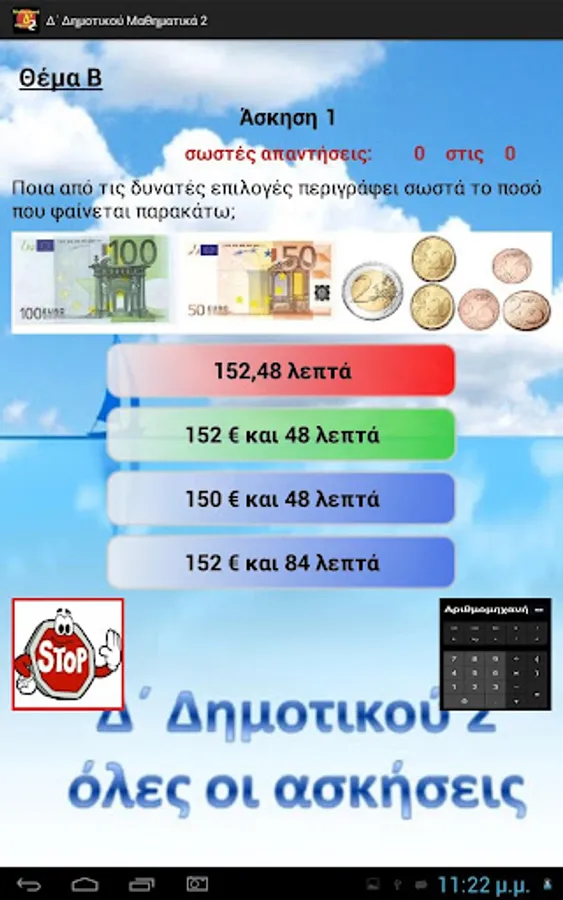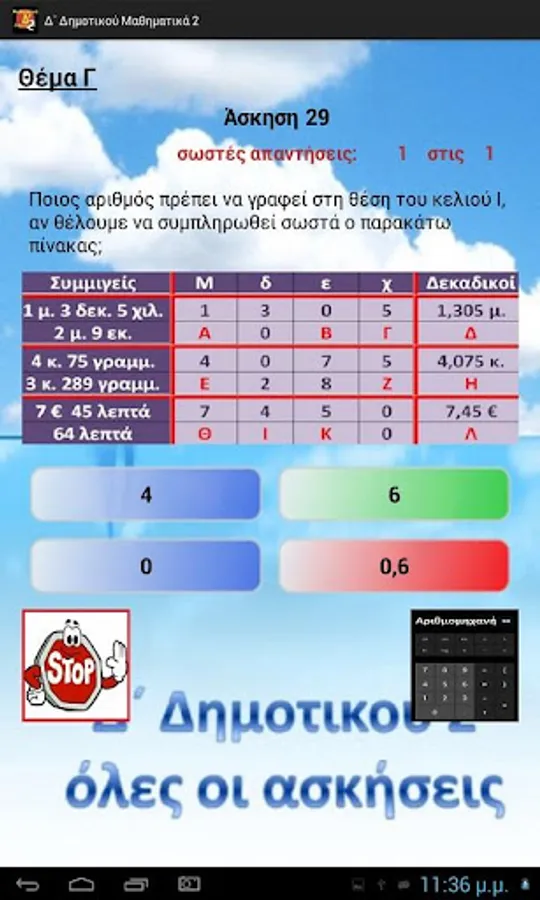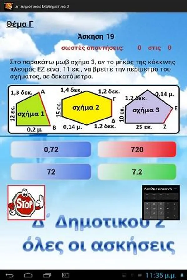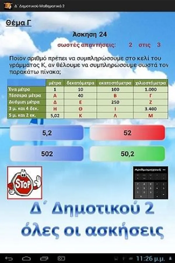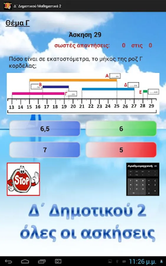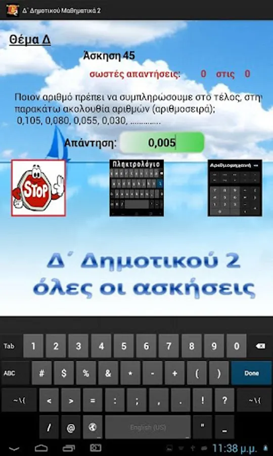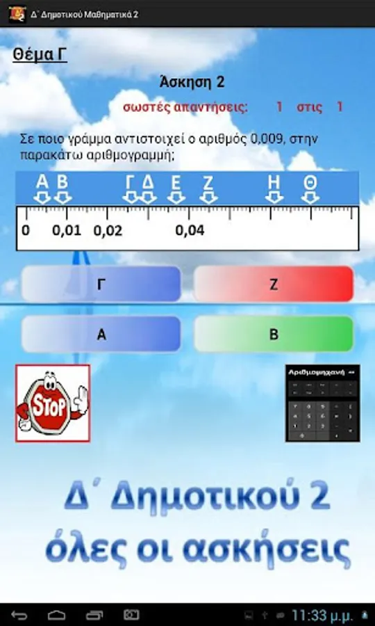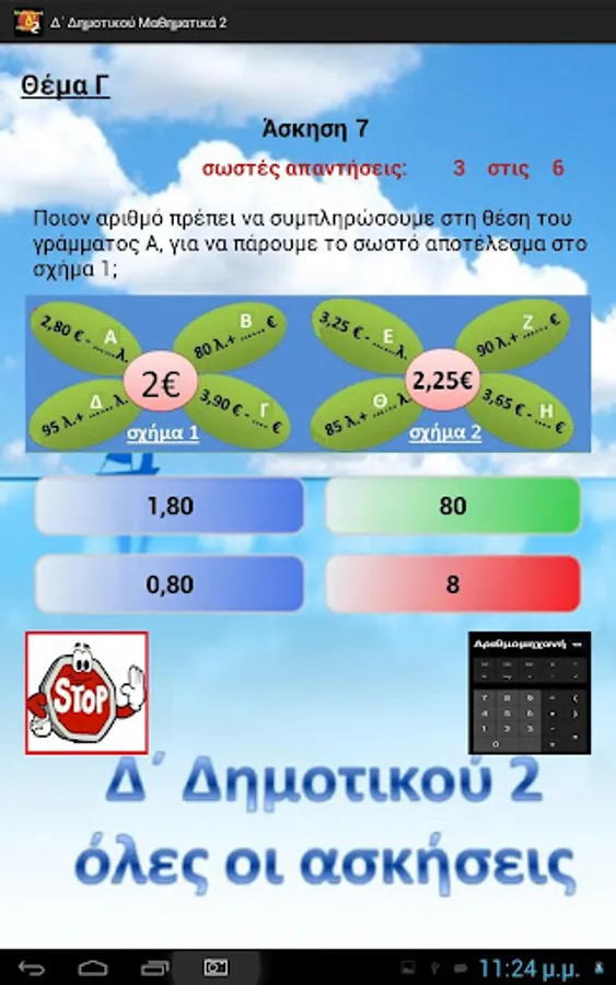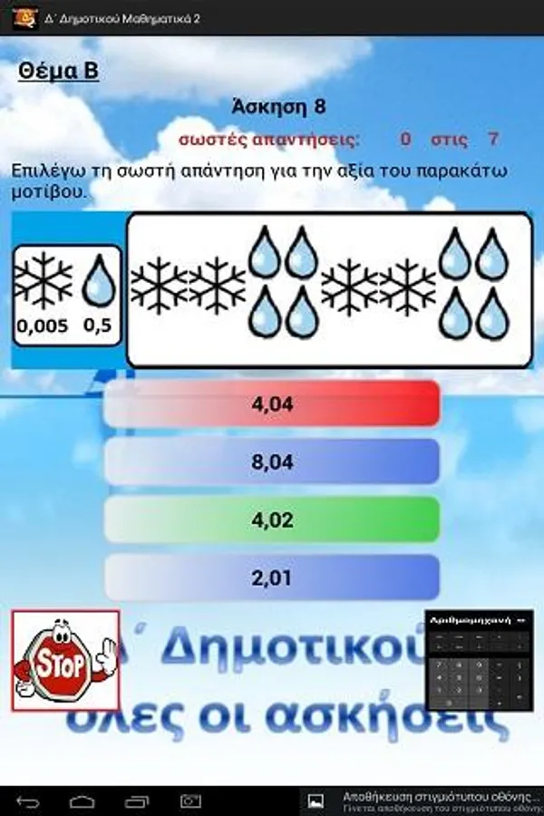 The student can repeat the modules he wants by practicing only the exercises of a subject. With all the exercises stored on the base, for example, as Topic A. All of the Correct-Wrong suggestions, or those who want them, since there is a STOP button to end the process. Because access in this case is serial, it is possible to continue at some other time practicing the exercises, from where it stopped. So he can slowly deal with all the exercises of the application. Similarly, it can deal with all, or those who like, the exercises of Topic B, Multiple Choice, Topic C Multiple Choice with Image, or Topic D Problem Solving. In this case, the student can also use the built-in calculator for operations.