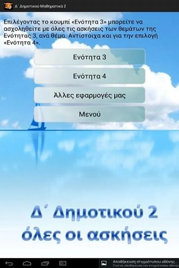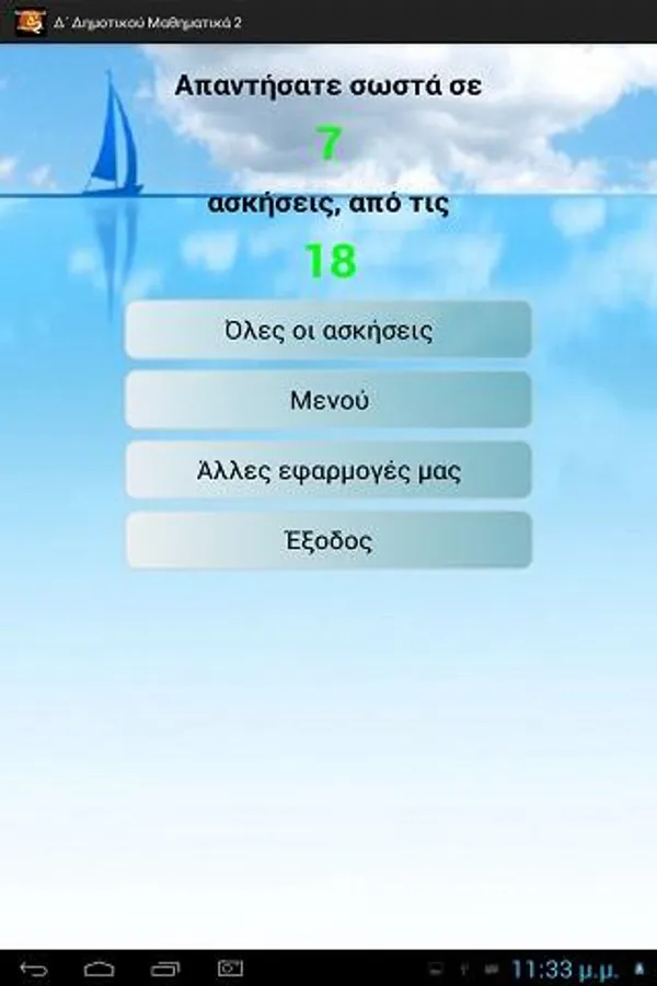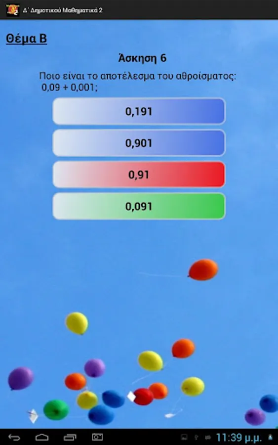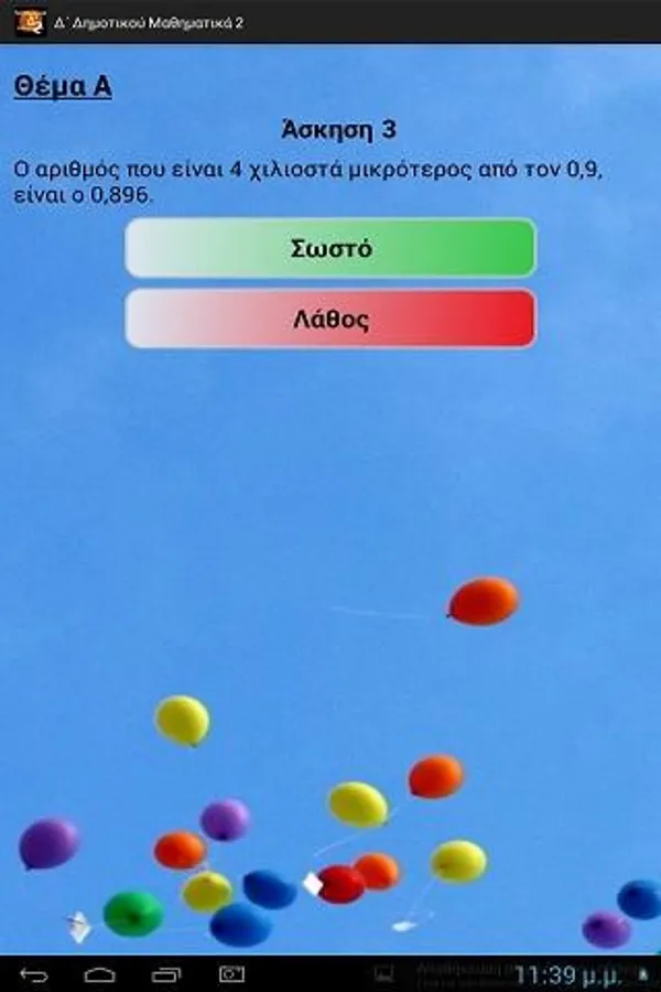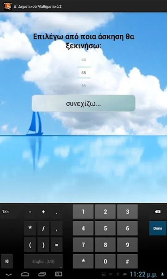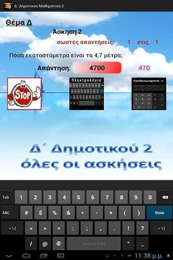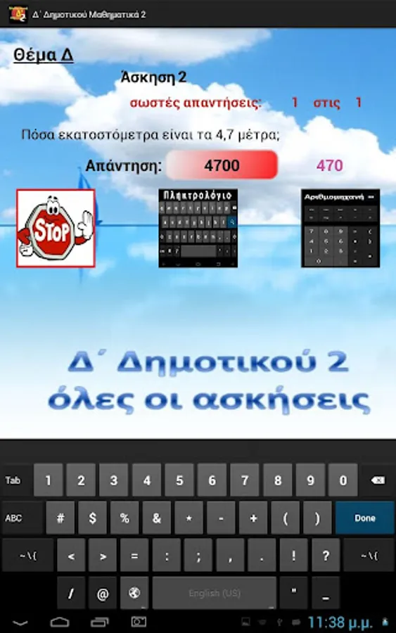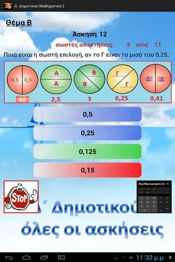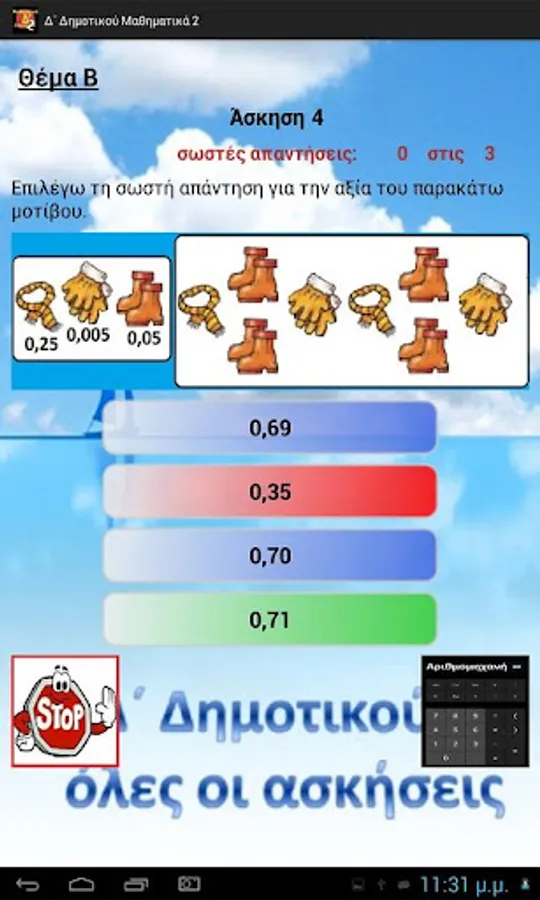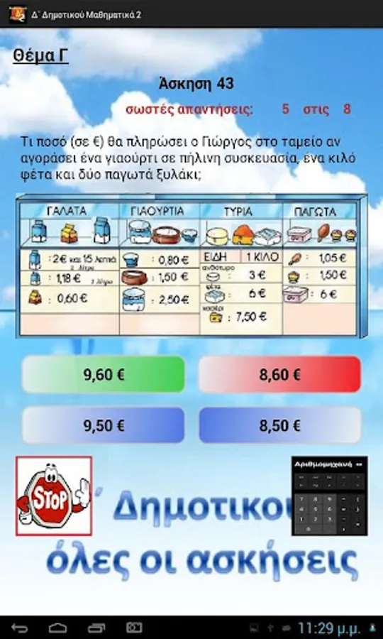 The student can repeat the modules he wants by practicing only the exercises of a subject. With all the exercises stored on the base, for example, as Topic A. All of the Correct-Wrong suggestions, or those who want them, since there is a STOP button to end the process. Because access in this case is serial, it is possible to continue at some other time practicing the exercises, from where it stopped. So he can slowly deal with all the exercises of the application. Similarly, it can deal with all, or those who like, the exercises of Topic B, Multiple Choice, Topic C Multiple Choice with Image, or Topic D Problem Solving. In this case, the student can also use the built-in calculator for operations.