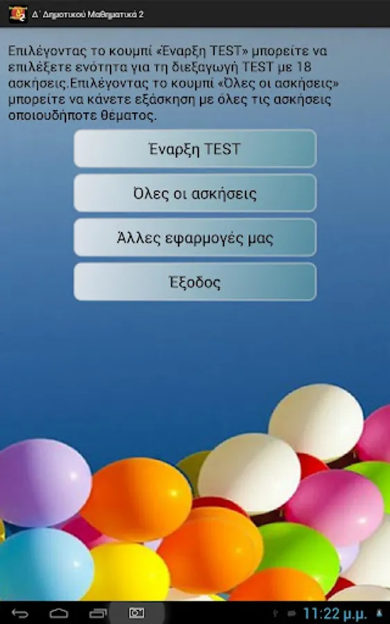 TEST of 18 exercises, in 4 themes (True - False, Multiple Choice, Vacancy, etc.). The exercises in this case are randomly chosen from the application's exercise base, and for that reason never two TESTs will be the same, since millions of exercise combinations are created without exaggeration. The pupil in a short time can control his knowledge without the tedious but mostly time-consuming writing.