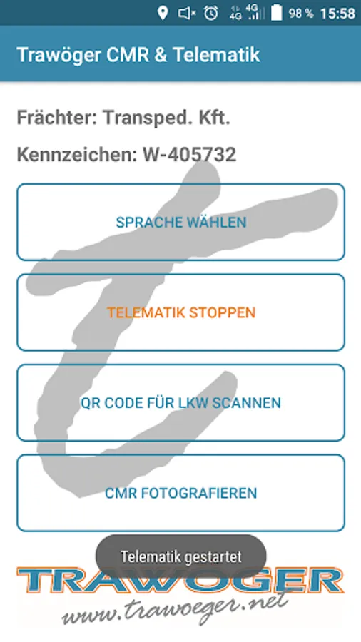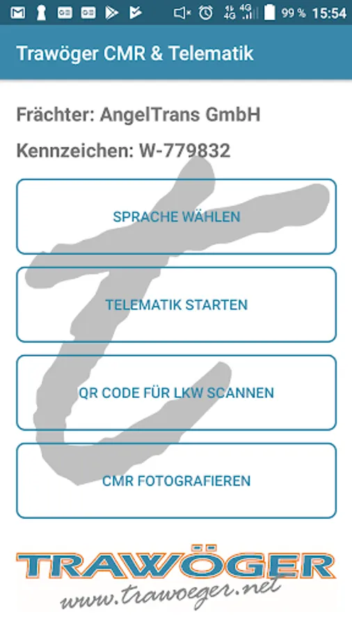 With this app, drivers of forwarding companies who carry out transports on behalf of Trawöger Transport GmbH can send photos of CMR consignment notes directly to Trawöger. In addition, telematics data can be transmitted to Trawöger.