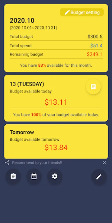 The "Daily Budget : Budget Reminder" is a very simple and easy-to-use app for managing your budget. If you set a monthly budget, we'll automatically calculate the day's budget for that month.Your available budget for today and tomorrow is automatically calculated. We will reduce spending by alarming the remaining budget for that month and the remaining budget for the day.