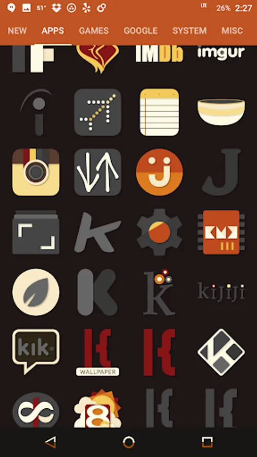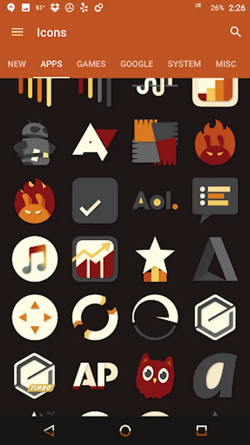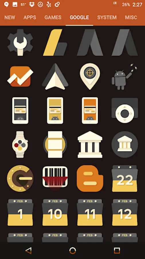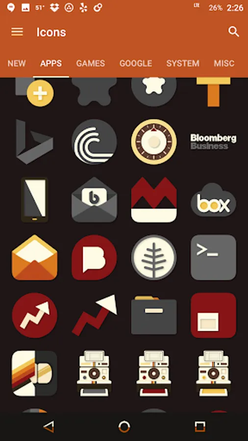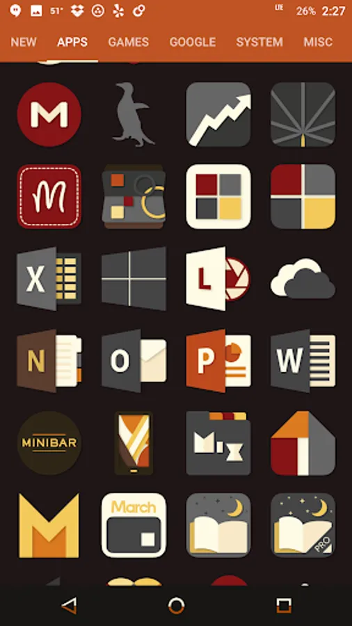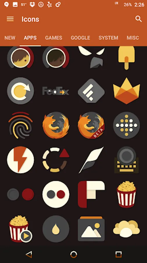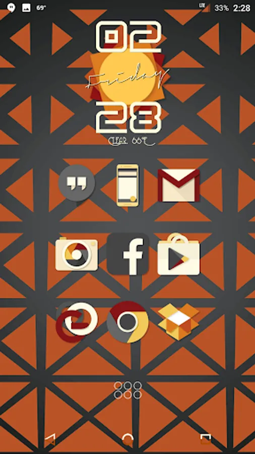 Desaturated colors leaving only red and orange tones with highest quality iconography, hundreds of matching wallpapers included, and full launcher support for all popular launchers!