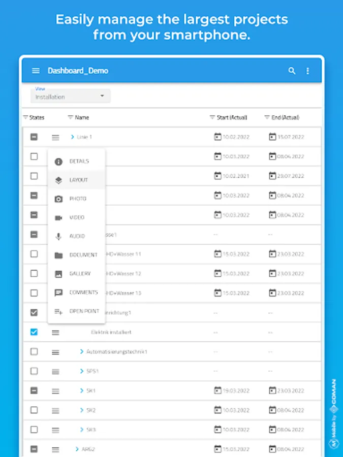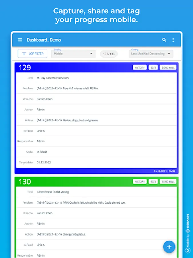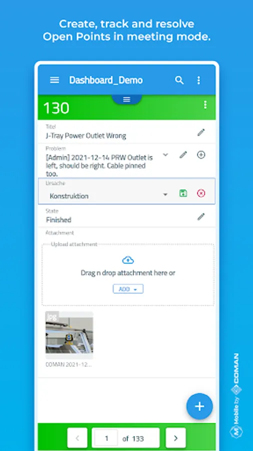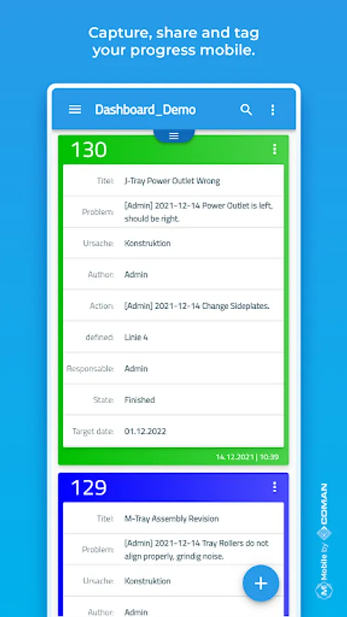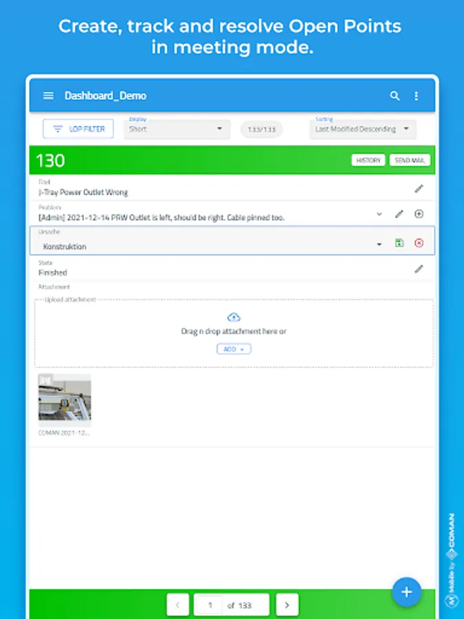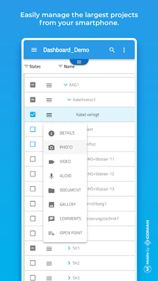 The app for digital project tracking! Mobile by COMAN brings together all the issues and tasks of your project in a single place so that all project participants can work with the same information at all times - regardless of your project being a machine, a production plant or a space shuttle.