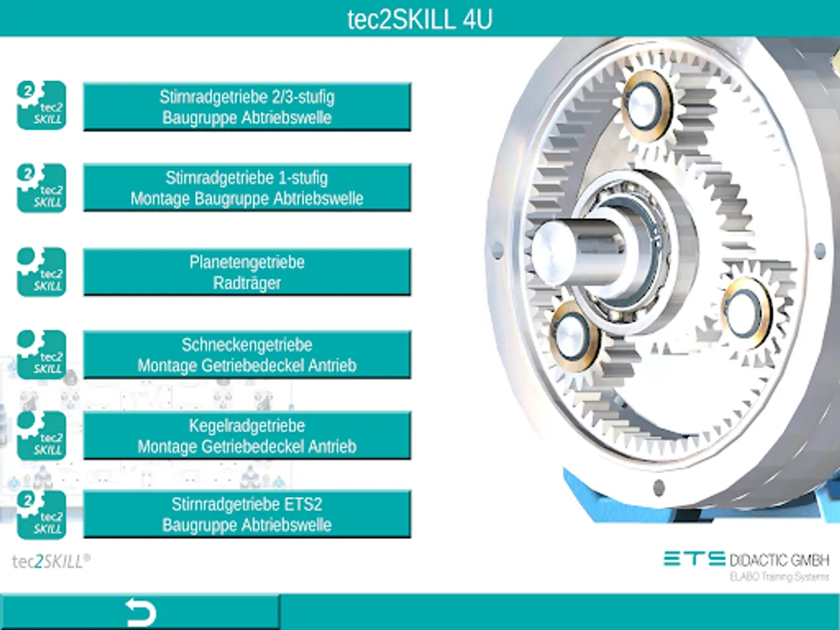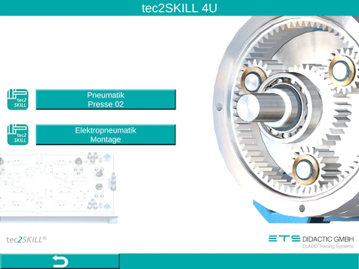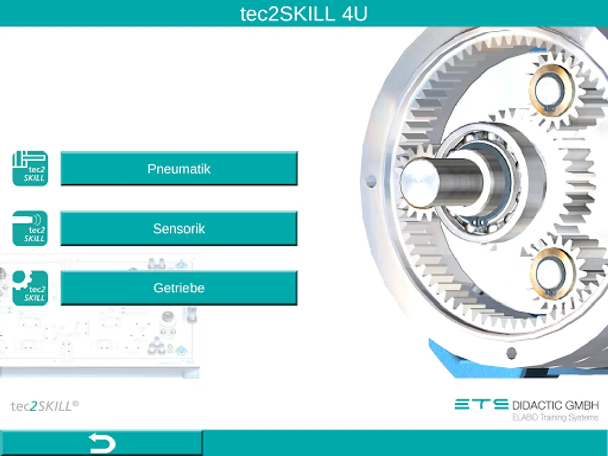 The tec2SKILL® 4U app shows the tec2SKILL® learning applications. These are digital assistants for didactic support in the field of gear technology, sensors and pneumatics. It supports the pneumatic and electro-pneumatic training system, the sensor training system and the industrial gear kits from ETS DIDACTIC GMBH.