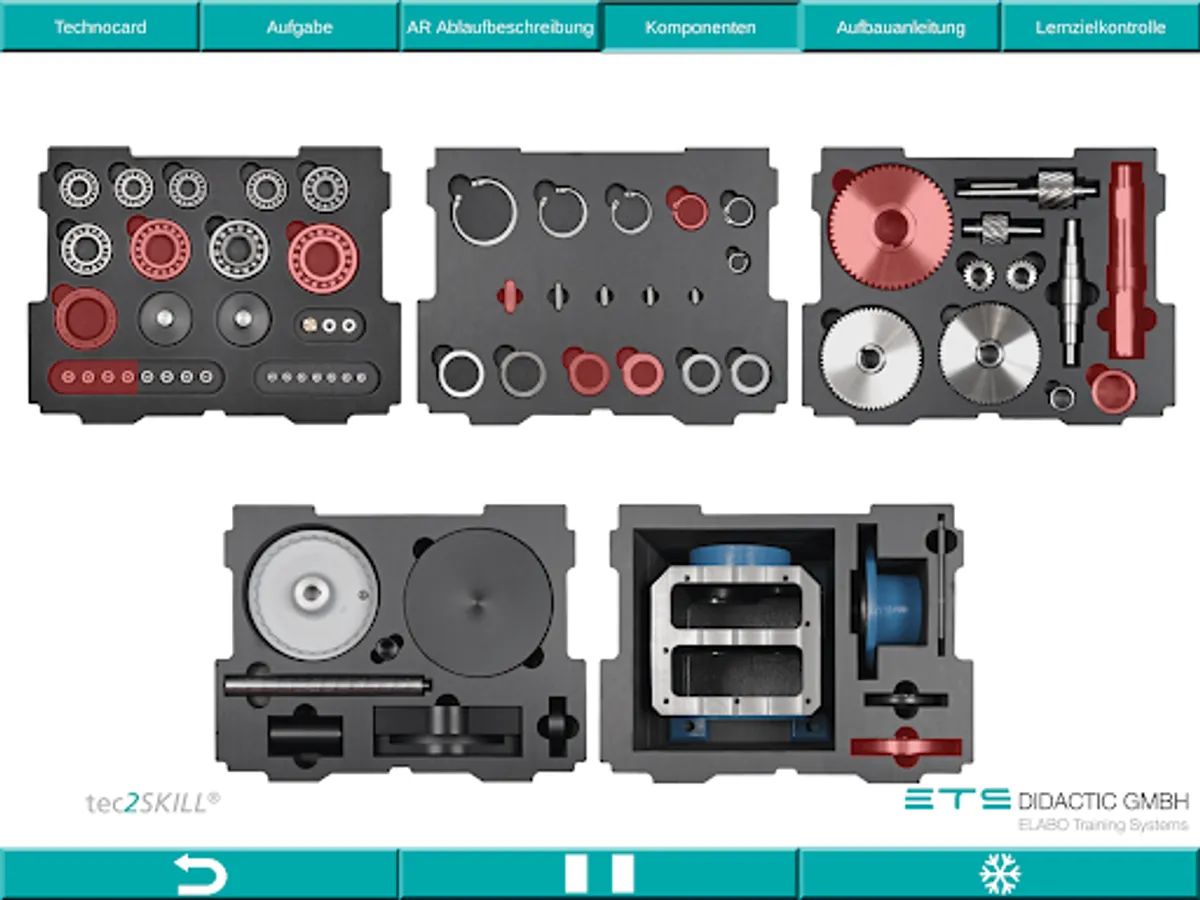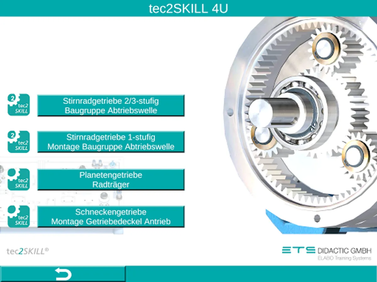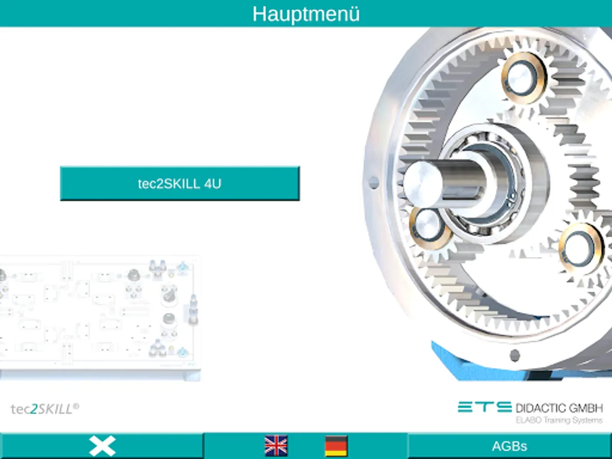 The tec2SKILL® 4U app shows the tec2SKILL® learning applications. These are digital assistants for didactic support in the field of gear technology, sensors and pneumatics. It supports the pneumatic and electro-pneumatic training system, the sensor training system and the industrial gear kits from ETS DIDACTIC GMBH.
