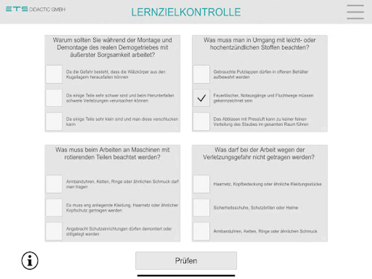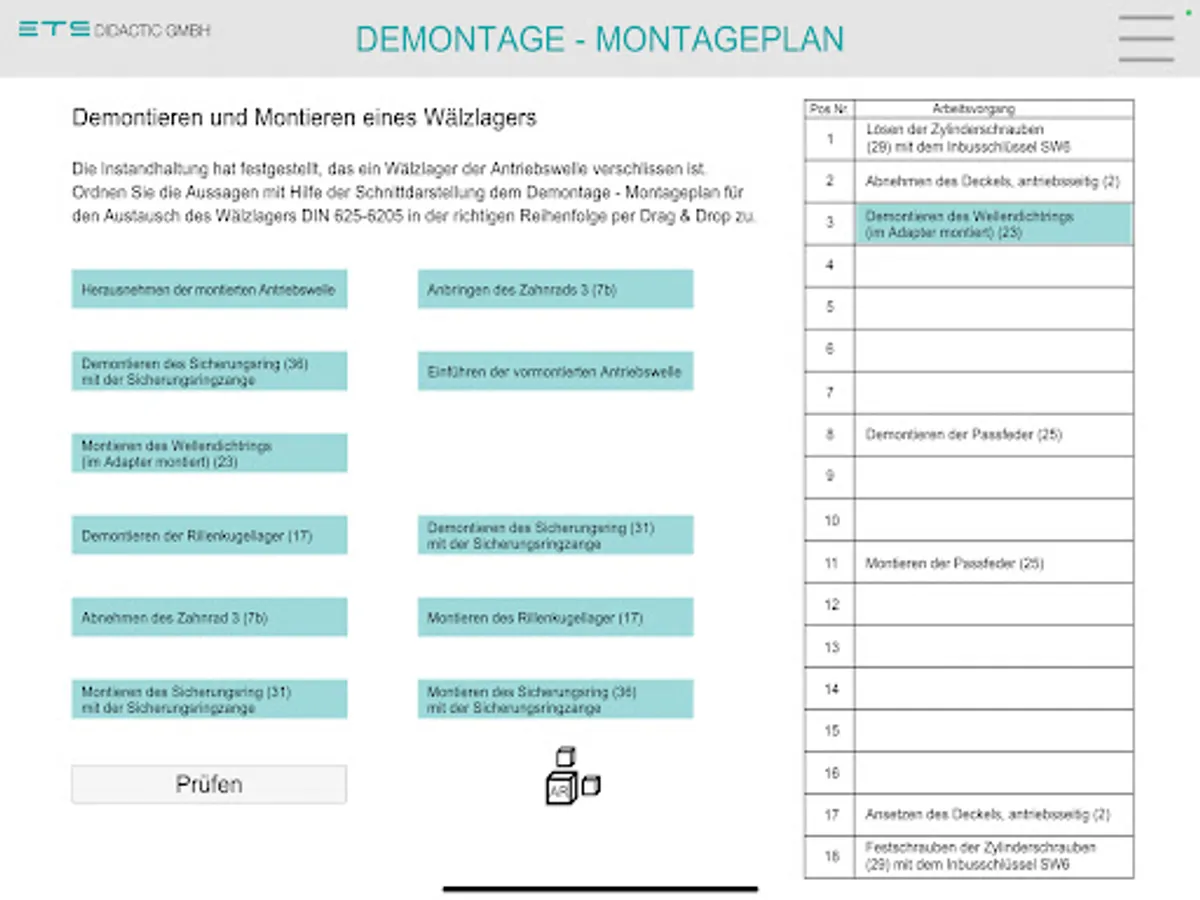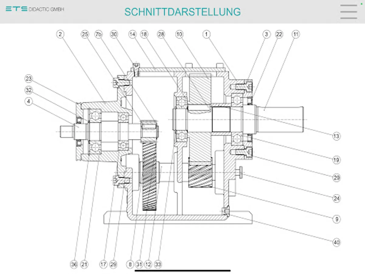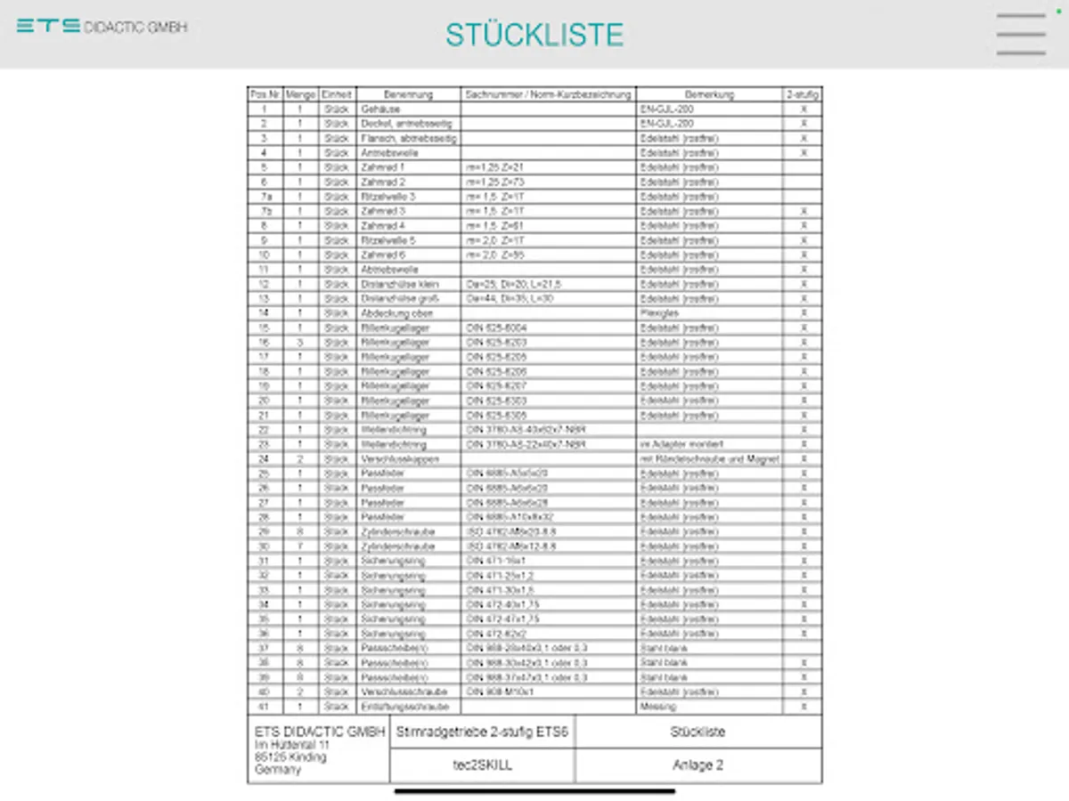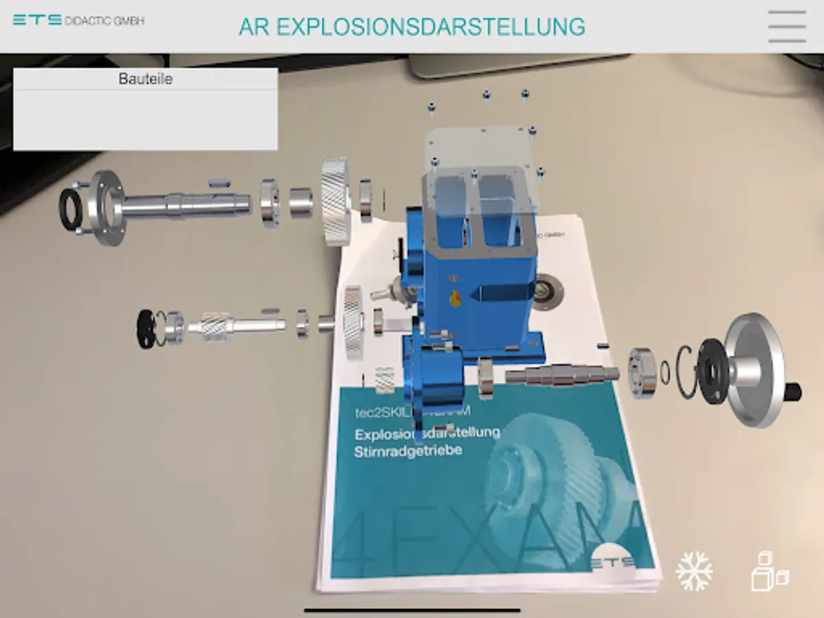 Die Lernanwendung tec2SKILL® 4EXAM ist ein digitaler Assistent zur didaktischen Unterstützung im Bereich der Getriebetechnik. Es werden industrielle Getriebe-Bausätze von der ETS DIDACTIC GMBH unterstützt.