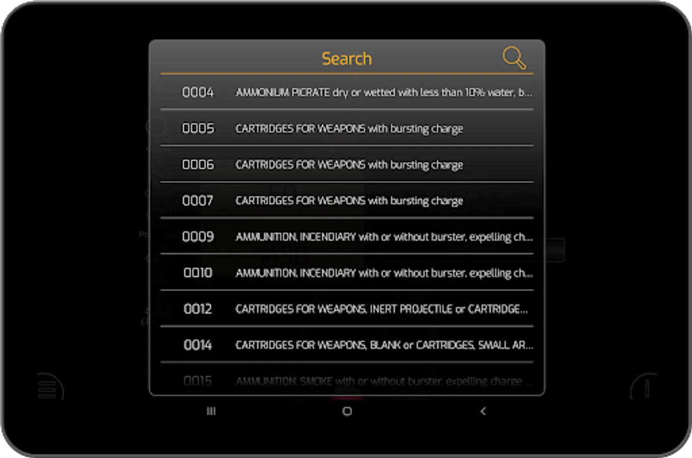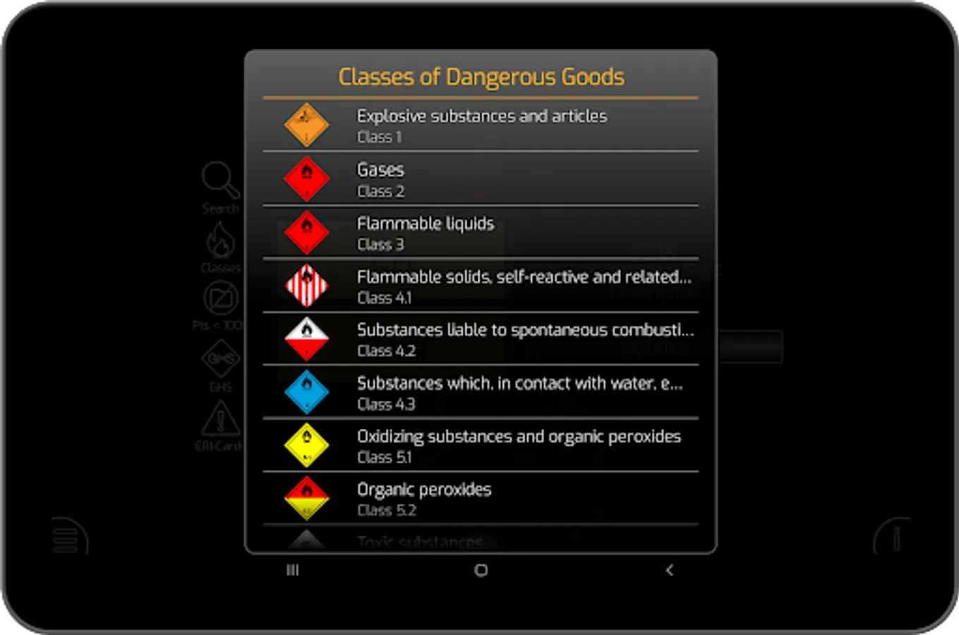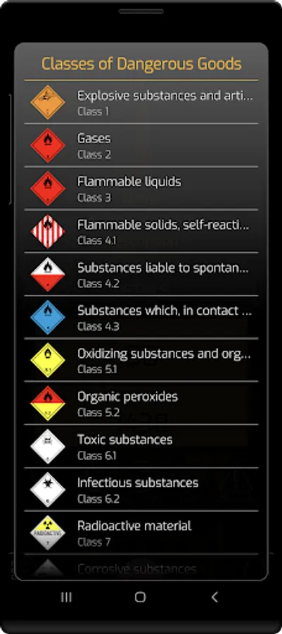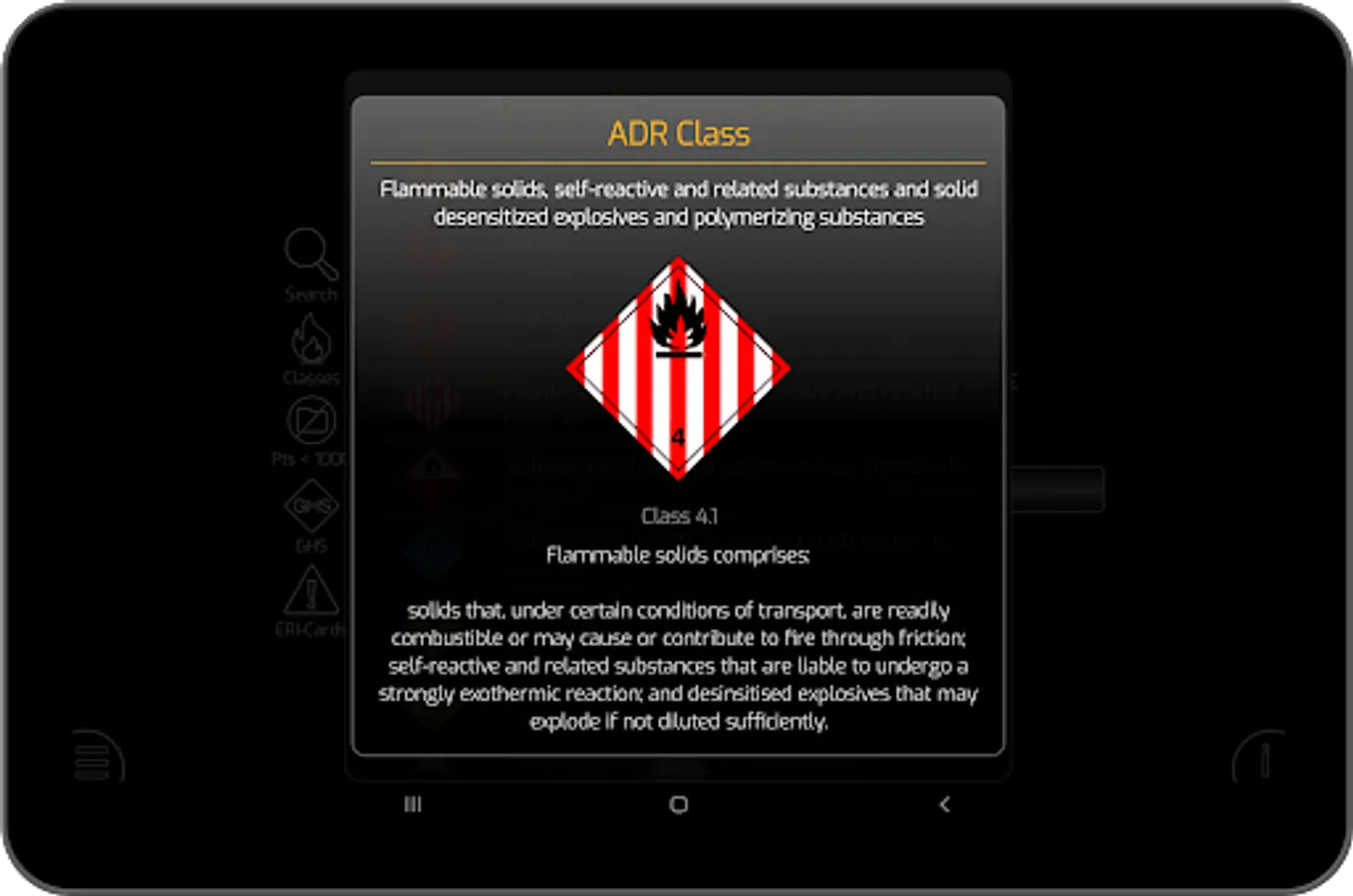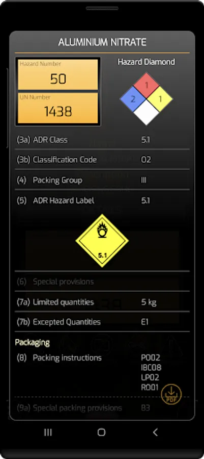The Dangerous Goods - ADR Pro is used for identification of hazardous substances on the UN number or the substance name and provides details on risk number, (3a) ADR-class, (3b) Classification code, (4) Packing group, (5) ADR Hazard Label, (6) Special provisions, (7a) Limited quantities, (7b) Excepted Quantities, (8) Packing: instructions, (9a) Packaging: Special packing (9b) Packaging: Mixed packing, (10) Portable tanks: Instructions, (11) Portable tanks: Special provisions, (12) ADR tanks: Tank code, (13) ADR tanks: Special provisions, (14) Vehicles for tanks carriage, (15) Transport category, (15) Tunnel code, (16) Special provisions: Packages, (17) Special provisions: Bulk, (18) Special provisions: Loading, unloading, (19) Special provisions: Operation