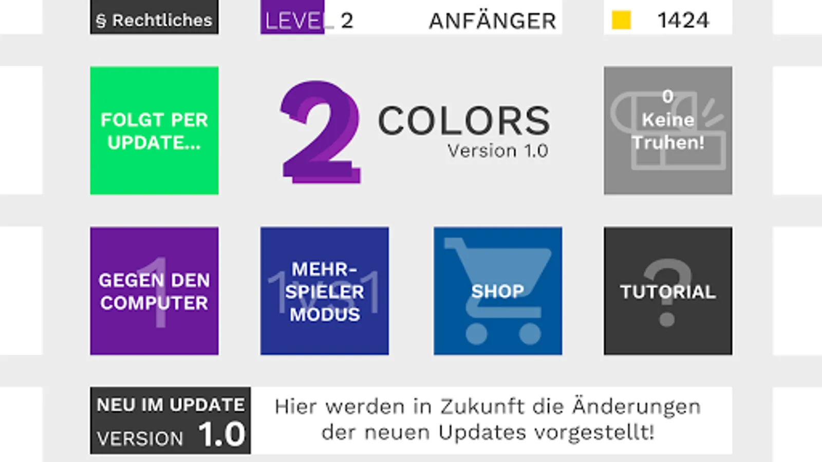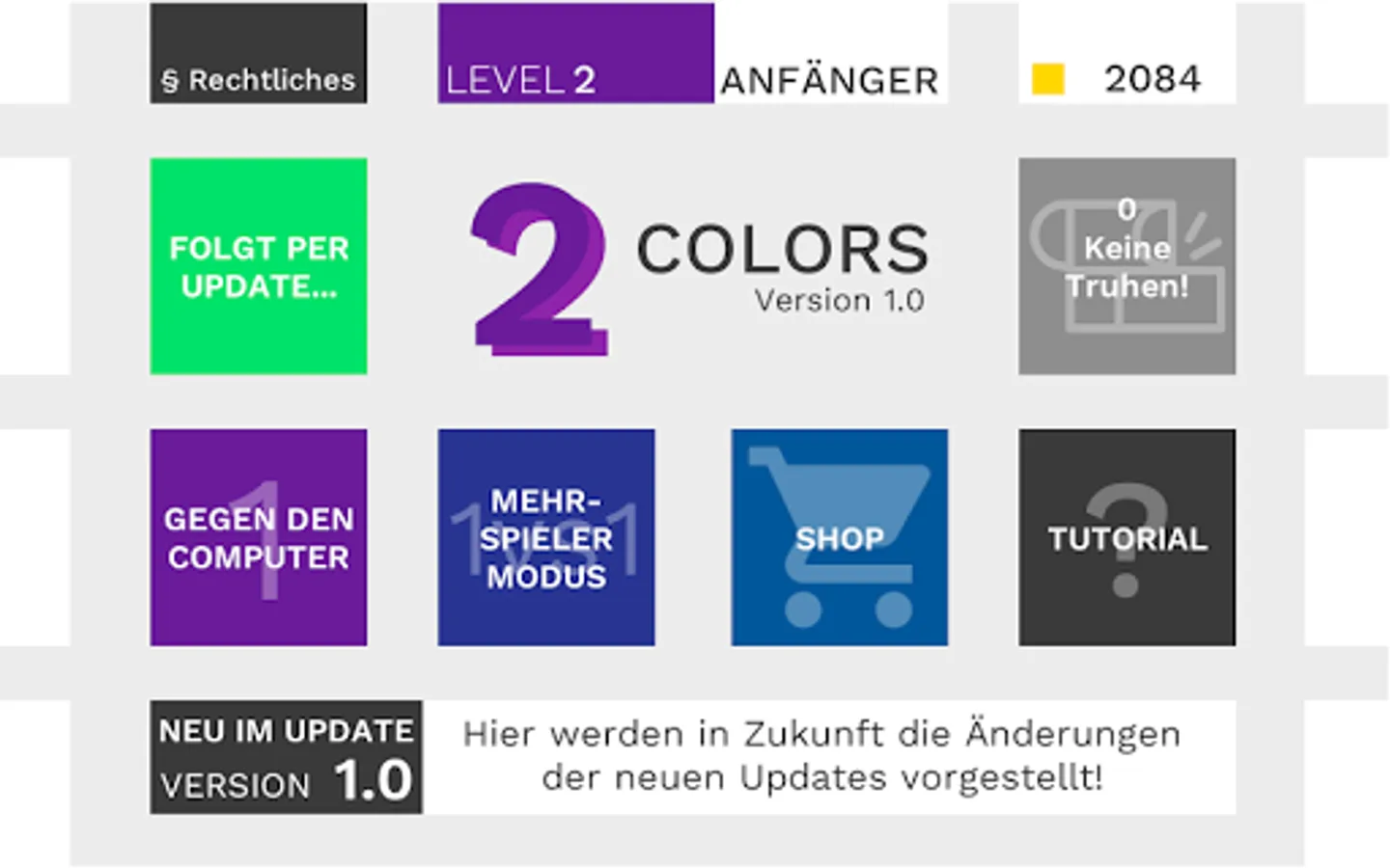 2Colors was finished after three months of development by me (I'm 16). In future, more content is coming in regular updates! This game is currently only in German language available in-game! Localization coming soon!