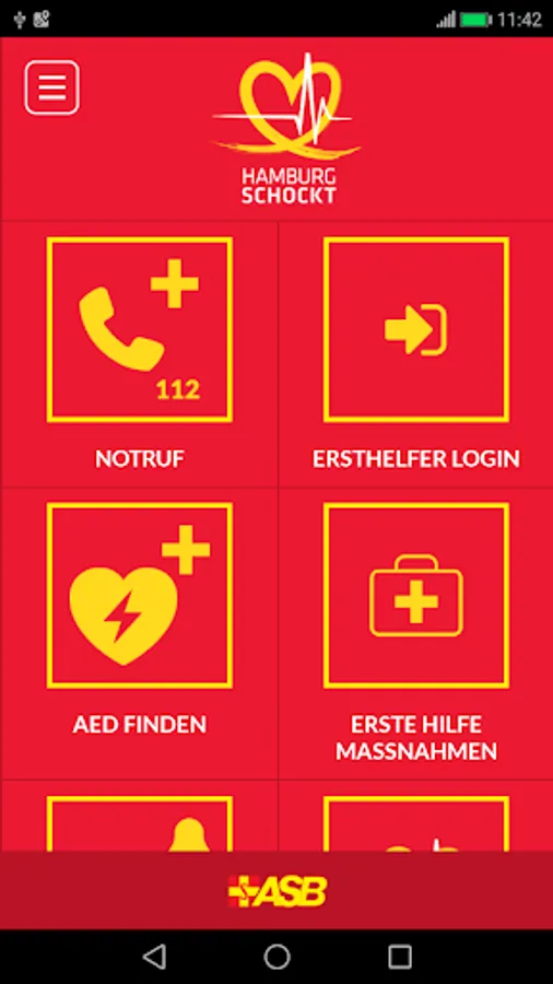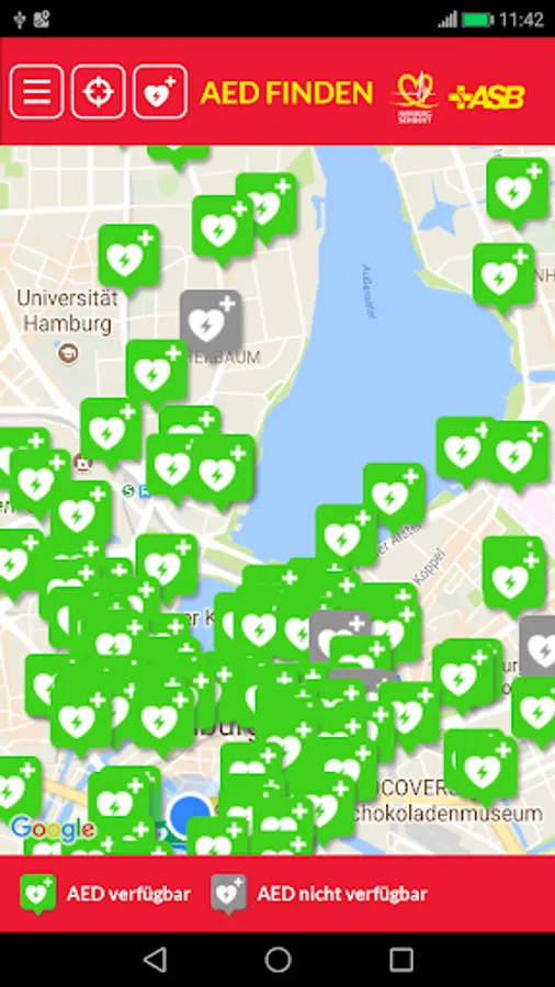 HAMBURG shocks app locates AEDs (Automated External Defibrillators, Defibrillator, Defi, lay-defibrillator). These will be shown on a google-maps-map, along with information about the application deaillierten. The app includes a First Aid Quick Reference Guide and an emergency call button.