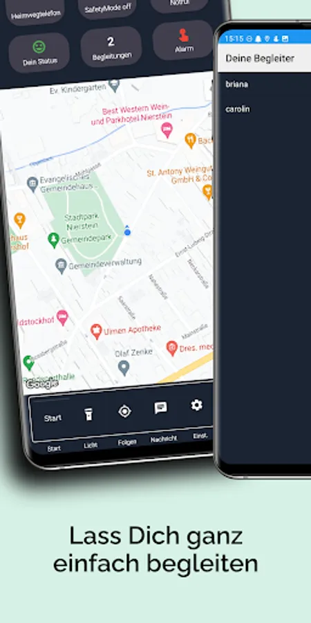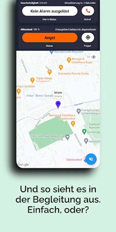 Your companions receive your location data in text form as a three-word address (what3words) and visually as a map. In addition, you will soon be able to display all hospitals.