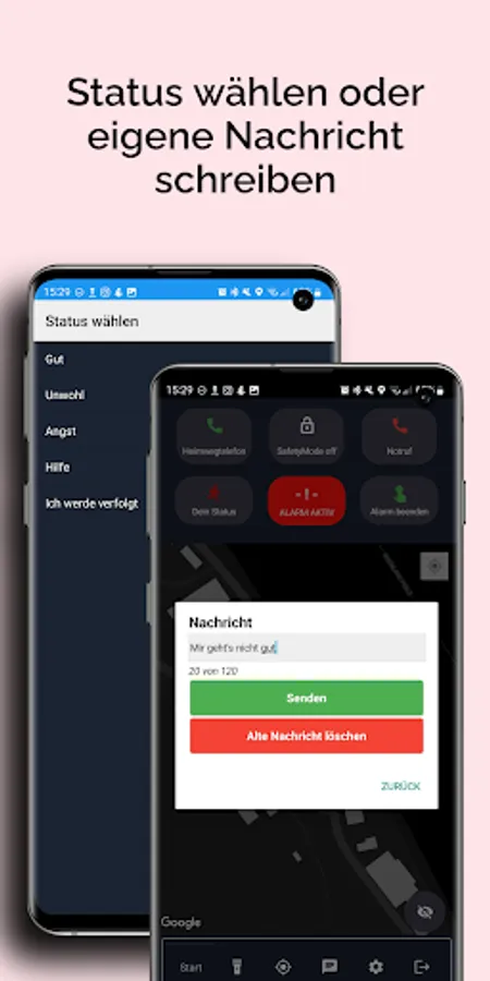 An emergency SMS with your location (longitude and latitude, as well as a link to your location via GoogleMaps) is sent to all contacts you have specified as soon as you trigger the alarm or make an emergency call.