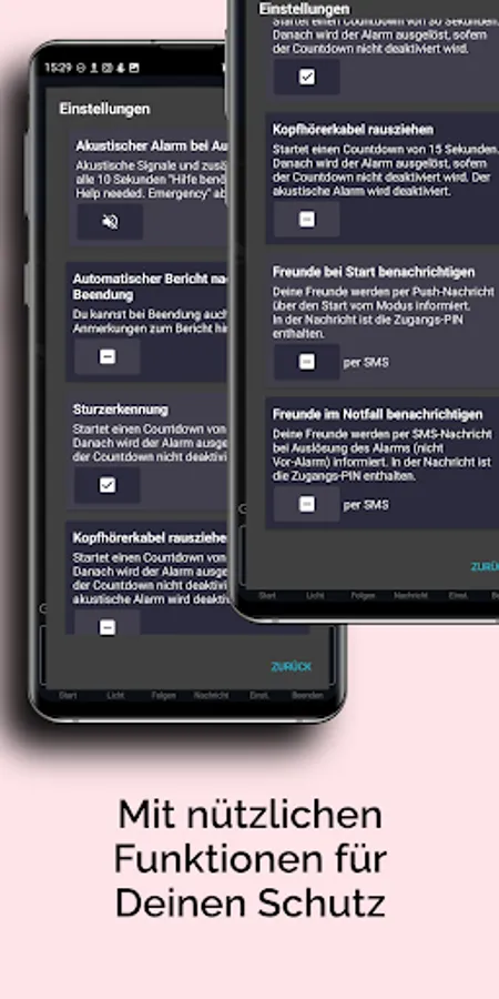 did you fall? The app recognizes it and acts! From now on you have 30 seconds to deactivate the pre-alarm. If this is not deactivated, the correct alarm starts, which causes the display on your companions to start flashing and their smartphone to vibrate.