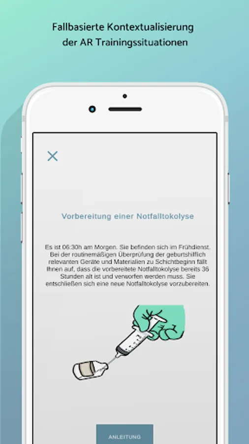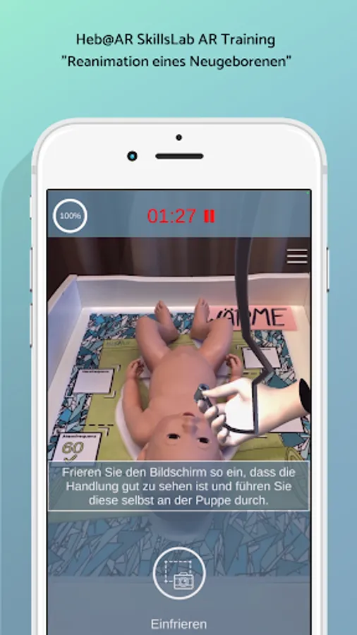 On the one hand, it can be used to supplement practical units in skills labs at universities. Here students then have to make decisions during the training and carry out instructions themselves using AR on training dummies. These trainings require special training dummies and additional materials. Training sessions of this type in the app are “Reanimation of a newborn” and “Preparation of a pregnant woman for a caesarean section”.