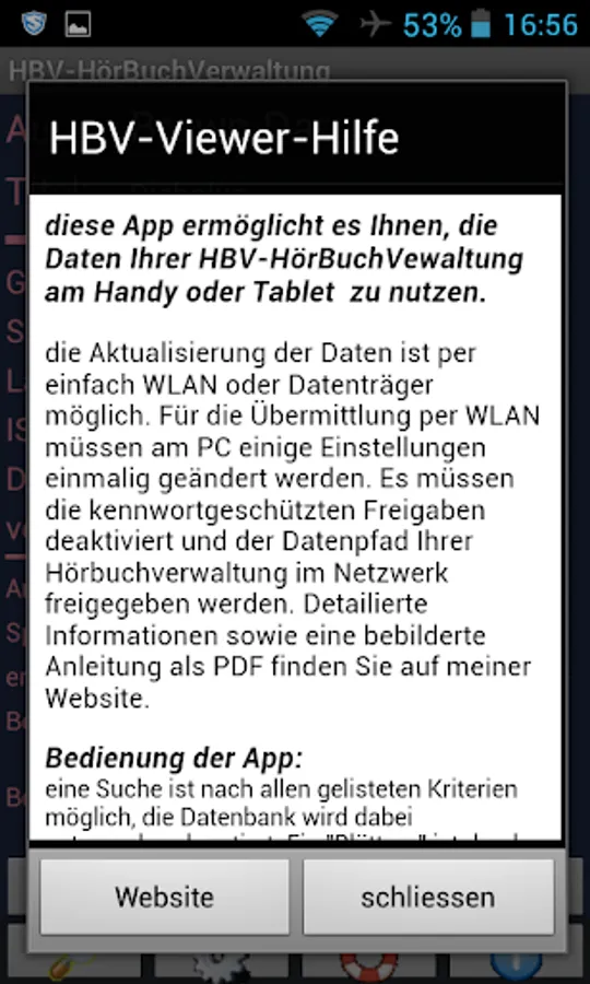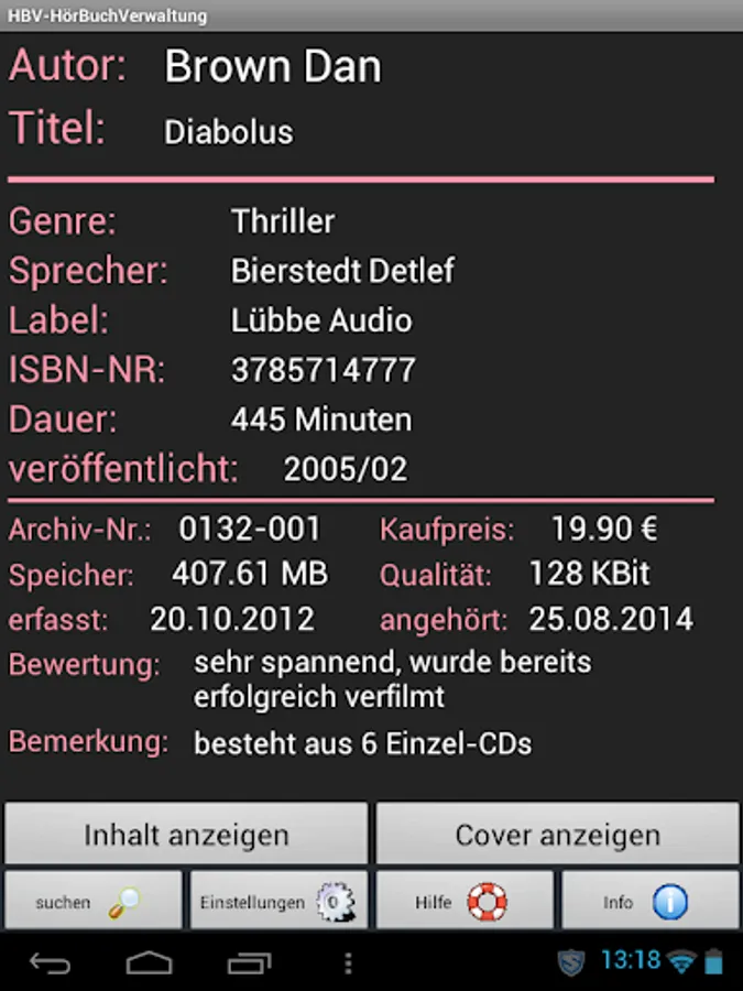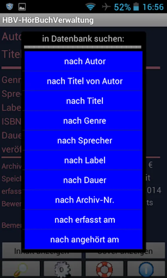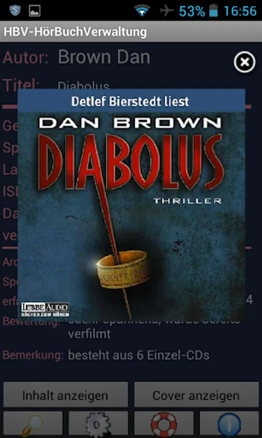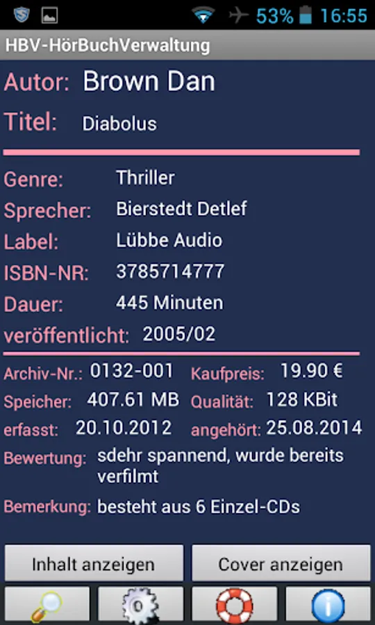 a search is possible for all listed criteria, the database is then sorted accordingly. A "Scroll" is by wiping from left to right or right to left = forward = backward possible. For ease of presentation, the color changes according to the settings for each new record. If content or cover files exist, the respective buttons are available. These files are displayed in a new window, the "back" can be explained by the Exit icon on the top right or the Device Button close. The font size of the Table of Contents can be zoomed continuously with a slider. On request, the summary will be read (if a German TTS voice activated / available).