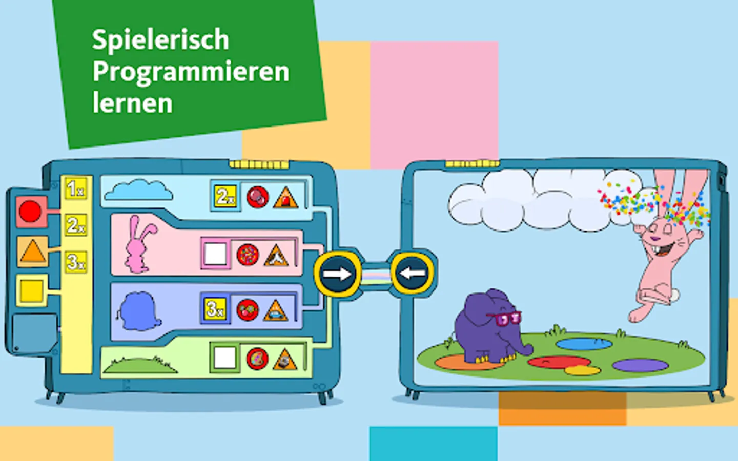Learn to program with the If-Then machine and determine what the elephant, rabbit, cloud and ground should do. The first basics of programming are taught in a playful way on four different levels: the if-then principle, repetitions and events.