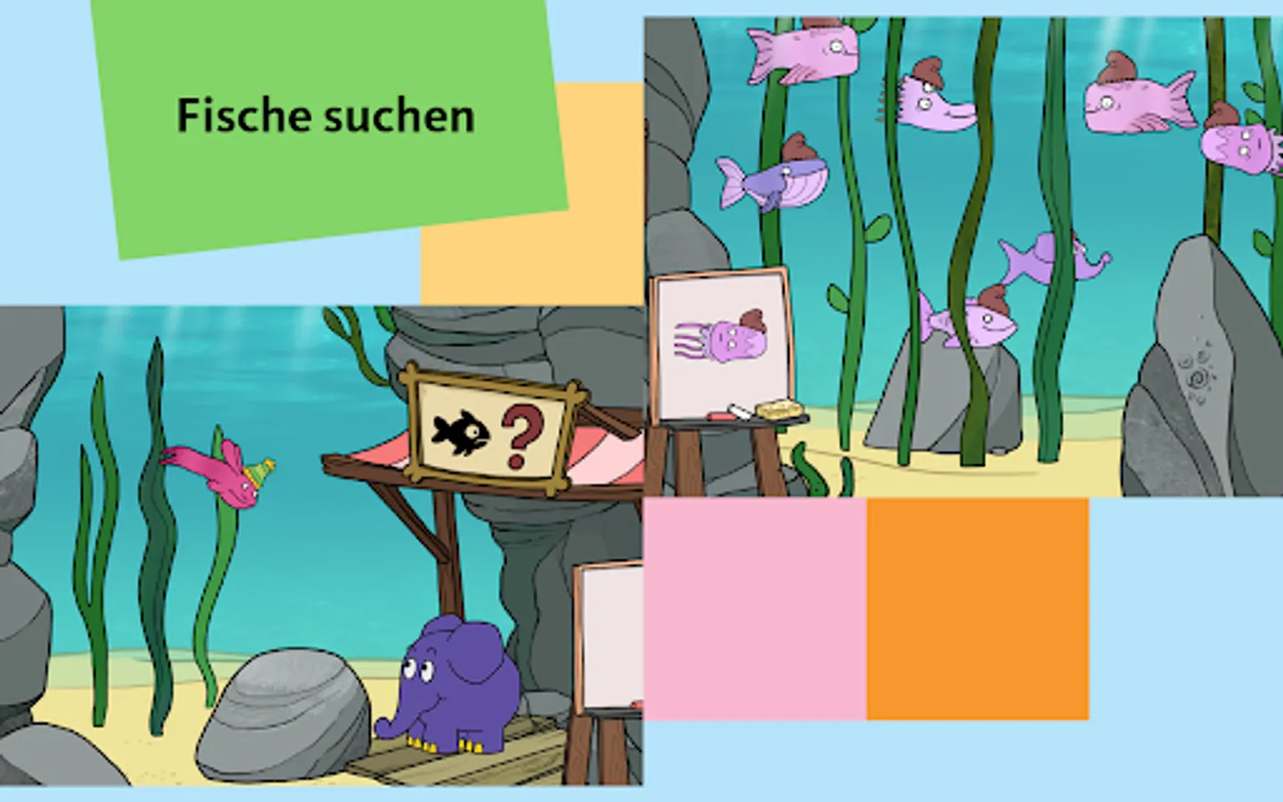 In the fish-find game one of the fish has lost his friend. Help the elephant find it again. To do this, you have to choose the right fish in the sea.