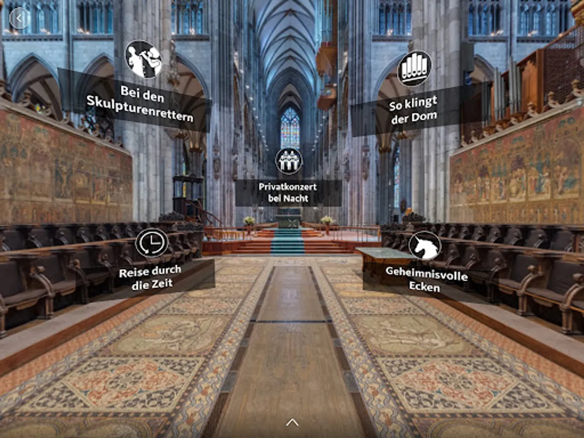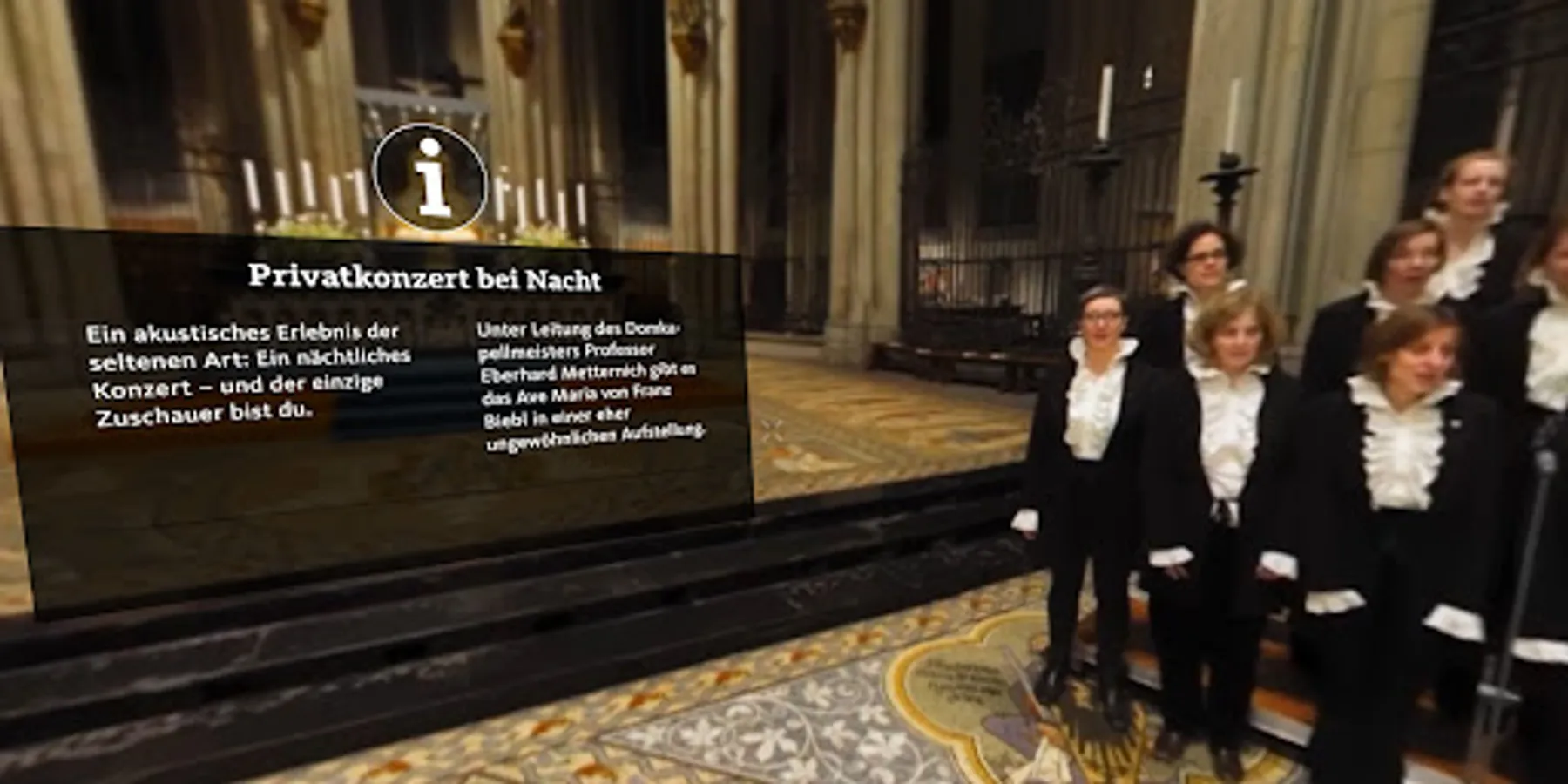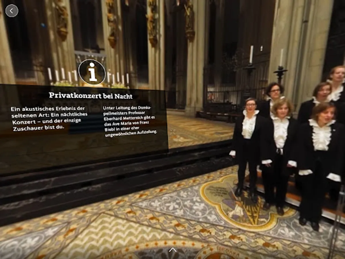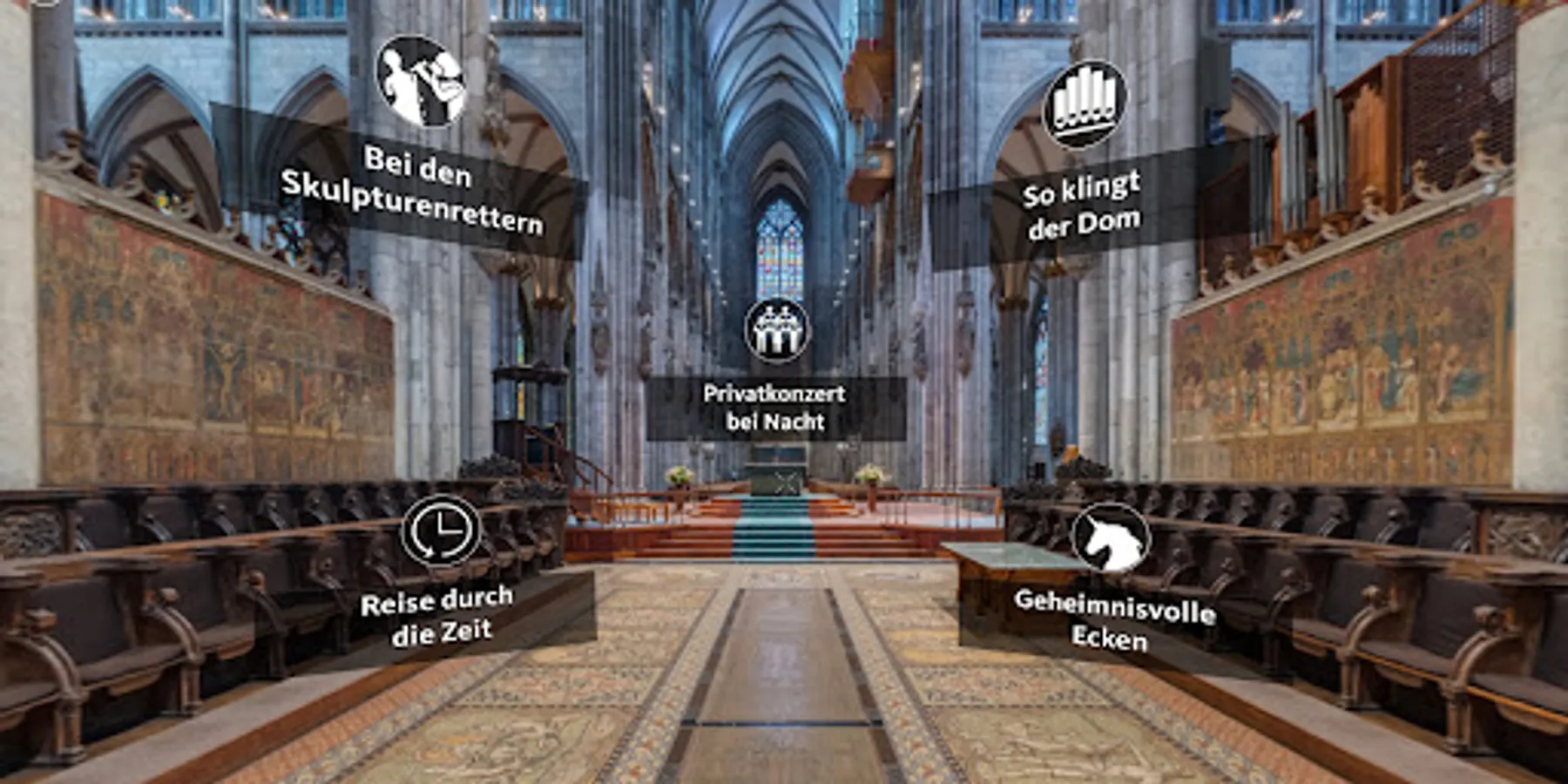 With the help of this app you can experience the Cologne Cathedral in an all-round view - as if you were right in the middle. Change the perspective by panning your smartphone or tablet or swiping within the image. Immerse yourself even more intensively in our 360° offer if your smartphone is combined with VR glasses or a cardboard. The content of this app is updated regularly and continuously.